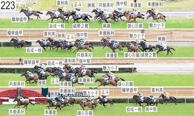 在閘後巡行時,「公平競技」被他駒踢中。獸醫檢查「公平競技」,發現該駒右前腳有一處割傷,因而不適宜出賽。小組按照獸醫意見,著令「公平競技」退出。「公平競技」必須通過獸醫檢驗後,才可再次出賽。 「幸運勝利」入閘困難。「幸運勝利」必須經閘廂測試及格後,才可再次出賽。 「勝風」出閘緩慢。 「強中堅」、「幸運勝利」及「幸運聖」自外檔起步後不久均在馬群後面切入。 轉直路彎時,「勝風」與「正斗」緊迫競跑。 同樣在轉直路彎時,「雄心巨龍」被「興趣」帶出更外疊,當時「興趣」被「威勢之寶」帶向外跑,而「威勢之寶」則正在墮退。 過了二百米處後在一段途程上,「強中堅」受困而未能望空。 在直路上,「幸運勝利」內閃及難以催策。 「威勢之寶」沿途在外疊沒有遮擋下競跑,直路上墮退。「威勢之寶」大敗而回,小組認為該駒的表現難以接受。「威勢之寶」必須試閘及格,並且通過獸醫檢驗後,才可再次出賽。 被查詢時,李寶利表示,由於「耀華盛甲」是匹均速馬,覺得居於前列有利牠發揮,因此賽前他獲指示盡可能將坐騎置於領放馬後面競跑。他說,在早段他打算將「耀華盛甲」向內移入至「自成一格」後面,佔取有遮擋的位置,然而,當他嘗試收慢「耀華盛甲」以佔取此位置時,「正斗」推進至其內側,令他居於領先馬匹外側沒有遮擋的第三疊位置。他說,因此他選擇推進至內欄領放位置,而非繼續在沒有遮擋下走外疊。賽後獸醫立即檢查「耀華盛甲」,並無發現任何明顯異常之處。 「興趣」於轉直路彎時被收慢。賽後獸醫立即檢查「興趣」,發現該駒心律不正常。「興趣」必須試閘及格,並且通過獸醫檢驗後,才可再次出賽。 「共創美好」及「幸運聖」均須抽取樣本檢驗。