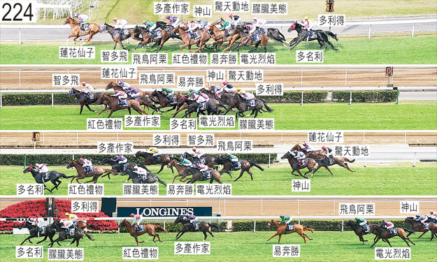 「丹頂龍」於十二月七日被小組按照獸醫意見(右前腿軟組織受傷)著令退出。「天文寶石」亦於十二月七日被小組按照獸醫意見(左前腿軟組織受傷)著令退出。 「電光烈焰」出閘緩慢。 「多利得」起步後不久在馬群後面切入。 首次跑過終點後,「紅色禮物」在外疊沒有遮擋下競跑。 「易奔勝」於接近八百米處時失去左後蹄的蹄鐵。 趨近及跑過六百米處時,「朦朧美態」在「神山」後面及「易奔勝」內側處於窘境。「朦朧美態」在直路早段受困而未能望空,跑過四百米處時移至馬群外側以望空。 「多利得」在直路早段難以望空,跑過四百米處時向內斜跑及碰撞「神山」。 跑過三百米處時,「神山」與「驚天動地」一度在「多利得」內側的窄位競跑,當時「多利得」向內移入以望空。 在末段,「驚天動地」在「智多飛」與「神山」之間的窄位競跑。 「飛鳥阿栗」沿途在外疊競跑,沒有遮擋。 被查詢有關「神山」令人失望的表現時,韋紀力表示,他今週曾策騎坐騎進行操練,他認為,坐騎在該課操練中表現甚佳。他說,「神山」前往起步點途中搶口,但自有利檔位出閘後在早段須受一路催策以保持前列位置。「神山」沿途過於搶口,儘管賽事的步速快,但坐騎未能放鬆來跑。由於「神山」的走勢,坐騎繼而於末段未能以勁勢衝刺。他又說,「神山」在直路上受催策時將頭轉側及內閃。賽後獸醫立即檢查「神山」,並無發現任何明顯異常之處。「多名利」及「朦朧美態」均須抽取樣本檢驗。