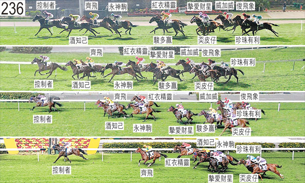 配鞍時,「飛馬之威」煩躁不安,以後足豎立並撞到頭部。獸醫檢查「飛馬之威」後,認為該駒不適宜出賽。小組按照獸醫意見著令「飛馬之威」退出。「飛馬之威」必須通過獸醫檢驗後,才可再次出賽。小組告知「飛馬之威」的練馬師賀賢,該駒必須試閘及格,並且通過亮相測試後,才可在跑馬地再度出賽。 「奀皮仔」起步時向外斜跑,導致「俊飛象」被帶向外跑壓向「珍珠有利」。「俊飛象」及「珍珠有利」自外檔出閘後不久均在馬群後面切入。 「摯愛財星」與「威加威」起步時互相碰撞。 趨近一千米處轉彎時,「威加威」將頭轉側並向著外側的「摯愛財星」的後蹄斜跑。 接近九百米處時,「駿多贏」一度在「永神駒」內側的窄位競跑,當時「永神駒」在向內斜跑後向外移出以紓緩對「駿多贏」的緊迫。 過了九百米處後,「奀皮仔」在外疊競跑,沒有遮擋。 趨近六百米處時,「駿多贏」靠近「永神駒」後蹄處於窘境之際昂首。 「威加威」轉直路彎時走勢笨拙。 「奀皮仔」在直路上將頭轉側、內閃並難以催策。賽後「摯愛財星」被發現左前腿有一個細小的傷口。 賽後獸醫立即檢查「奀皮仔」,並無發現任何明顯異常之處。 「紅衣精靈」、「控制者」以及「齊飛」均須抽取樣本檢驗。