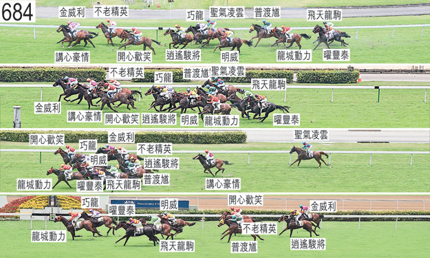 薛寶力因超磅而未能策騎「逍遙駿將」,被罰款五千元。該駒改由何澤堯策騎。韋達(「開心歡笑」)及見習騎師呂卓賢(「明威」)因未有於規定時間或之前到達亮相圈,各被罰款二千元。抵達起步點後,「不老精英」被發現口部有血。獸醫檢查「不老精英」後,認為該駒適宜出賽。「不老精英」於起步時失去左前蹄的蹄鐵。「明威」出閘時在雙雙斜跑的「普渡馗」與「逍遙駿將」之間受擠迫之際失去平衡。於此宗事件中,「普渡馗」亦失去平衡及失地。其後「明威」受催策以圖佔取前列位置。 「飛天龍駒」自大外檔出閘後不久在馬群之後切入。過了八百米處後,「逍遙駿將」在外疊競跑,沒有遮擋。 轉直路彎時,「普渡馗」靠近「巧龍」的後蹄處於窘境。其後「普渡馗」受困而未能望空直至接近三百五十米處,跑過二百米處時再度受困而未能望空。 轉直路彎時及於直路早段,「巧龍」試圖移至「開心歡笑」外側以望空 ,因而與「逍遙駿將」互相觸碰。 跑過三百米處時,「不老精英」在「金威利」與「講心豪情」之間受擠迫,當時「講心豪情」於開始墮退之際將頭轉側及內閃。 二百米處,韋達跌掉馬鞭。 賽後獸醫立即檢查「開心歡笑」,並無發現任何明顯異常之處。賽後獸醫立即檢查「講心豪情」及「聖氣凌雲」,並無發現任何明顯異常之處。「講心豪情」及「聖氣凌雲」均大敗而回,小組認為這兩駒的表現難以接受。「講心豪情」及「聖氣凌雲」均必須試閘及格,並且通過獸醫檢驗後,才可再次出賽。「龍城動力」及「巧龍」均須抽取樣本檢驗。