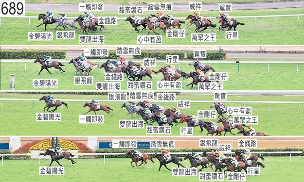賴維銘(「高高加瑪」)因起初過磅時沒有攜帶馬肚帶,被罰款二千元。 入閘後,「高高加瑪」煩躁不安,將頭低俯至閘廂前門之下,損壞了兩道前門。「高高加瑪」被牽出閘廂接受獸醫檢查,獸醫認為該駒不適宜出賽。小組按照獸醫意見著令該駒退出。「高高加瑪」必須試閘及格,並且通過獸醫檢驗後,才可再次出賽。當此宗事件發生時,「金碧陽光」亦煩躁不安,因而被牽出閘廂。由於該閘廂的前門經已損壞,因此該套閘廂在餘下賽事中沒有再被使用。 「威祥」與「行星」自外檔出閘後不久均在馬群之後切入。 「心中有盈」躍出時在「金剛仔」與「甜蜜鑽石」之間受緊迫,當時「甜蜜鑽石」向外斜跑。 起步後不久,「踏雪無痕」在雙雙斜跑的「萬眾之王」與「銀飛龍」之間嚴重受擠迫時失去平衡。在此宗事件中,「萬眾之王」被「踏雪無痕」碰撞後軀後失去平衡,因而進一步向內斜跑,並導致「踏雪無痕」在跑了一段短途程後須勒避。 千三米處,「踏雪無痕」收慢避開「萬眾之王」後蹄,當時「萬眾之王」被「雙龍出海」帶向內跑,而儘管見習騎師呂卓賢已努力阻止,但「雙龍出海」仍向內斜跑。其後,「雙龍出海」受催策以佔取前列位置,但未能帶離內側的馬匹,因而在餘下途程上在沒有遮擋下走外疊。 跑過三百五十米處時,「威祥」在「雙龍出海」與「金錢路」之間無路可上之際受困,當時「金錢路」在嘗試推進至「銀飛龍」外側之際向外斜跑。其後,「威祥」未能望空,跑過一百米處時在「雙龍出海」與「銀飛龍」之間受擠迫之際收慢,當時「銀飛龍」在被「踏雪無痕」(李富)帶向外跑之際受阻礙,而「踏雪無痕」則在催策下向外斜跑。跟隨「銀飛龍」的「金錢路」因而受妨礙。在是次情況下,小組嚴厲譴責李富,並告誡他日後應遠比是次更努力以保持坐騎直線競跑。 在末段,「行星」在「甜蜜鑽石」後蹄外側處於窘境。 賽後獸醫立即檢查「金錢路」、「行星」及「銀飛龍」,並無發現任何明顯異常之處。「銀飛龍」、「金碧陽光」及「一觸即發」均須抽取樣本檢驗。