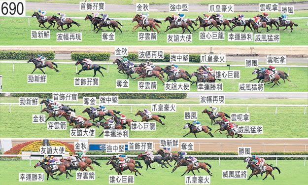 「幸運勝利」及「雲呢拿」均出閘緩慢。「勝風」及「威風猛將」自外檔出閘後於早段均在馬群之後切入。首次跑過終點時,「雲呢拿」於收慢以向內移入至「幸運勝利」之後時昂首。「波幅再現」於早段在沒有遮擋下走外疊,過了千五米處後獲許推進,接近千二米處時居領放馬外側。 「雄心巨龍」於直路早段頗為難以望空。 趨近一百米處時,「穿雲箭」向外移出避開「金秋」(布文),當時「金秋」在催策下向外斜跑,導致「友誼大使」在「幸運勝利」與「穿雲箭」之間緊迫競跑,當時「幸運勝利」傾向內閃,而「穿雲箭」向外斜跑。於此宗事件中,「友誼大使」與「幸運勝利」互相觸碰後雙雙失去平衡。小組告誡布文,在類似情況下坐騎斜跑時應修正坐騎。 被查詢時,杜利萊表示,鑒於「勁新鮮」是一匹均速馬,他獲指示讓坐騎帶頭。他說,根據策騎指示,他於早段催策坐騎,接近千八米處時他能夠將坐騎移入內欄領放。他說,其後他能夠在領放下減慢步速,但由於他獲指示讓坐騎帶頭,當「波幅再現」在過了千二米處後推進至「勁新鮮」外側時,他給予「勁新鮮」略長韁繩,以確保坐騎不會被「波幅再現」過頭。他說,過了千一米處後,他再度試圖減慢步速,但是日重戴眼罩的「勁新鮮」未有如他所願般放鬆來跑。他又說,然而過了八百米處後轉彎時,「勁新鮮」終能放鬆來跑,而他對其所締造的步速感滿意。他說,由於他獲悉他從未曾策騎的「勁新鮮」是一匹均速馬,過了六百米處後他讓坐騎加速,以圖拉開與餘駒的距離,希望坐騎能夠保持走勢至終點。他說,然而於二百米處前,「勁新鮮」須受催策,但未能以勁勢衝刺。小組告知杜利萊,由於「波幅再現」推進至「勁新鮮」外側,導致「勁新鮮」於過了千二米處後以較快步速競跑,所以小組認為杜利萊於當時的騎法並無不妥,但小組亦告訴杜利萊,他於接近六百米處時進一步加速,令坐騎做力所不及的事。小組告誡杜利萊,他必須確保盡可能以讓坐騎於末段能以勁勢衝刺的方式策騎。 賽後,貝湯美表示,「勝風」陣上走勢欠順。賽後獸醫立即檢查「勝風」,並無發現任何明顯異常之處。賽後獸醫立即檢查「雲呢拿」及「威風猛將」,並無發現任何明顯異常之處。 「幸運勝利」及「友誼大使」均須抽取樣本檢驗。