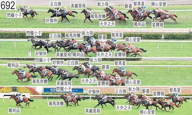 「智高星」出閘緩慢。 「開心至愛」及「星爾頓」自外檔出閘後於早段均在馬群之後切入。 趨近千二米處時,「新力飛」收慢讓「正白旗」過頭之際昂首。 過了一千米處後,「萬馬奔騰」收慢避開「美麗里程」(見習騎師吳嘉晉)的後蹄,當時「美麗里程」在尚未充分帶離下向內斜跑。跟隨在後的「醉喜」收慢避開「萬馬奔騰」後蹄,因而向內斜跑,導致「智高星」一度受擠迫。小組告誡見習騎師吳嘉晉日後在轉換跑線前須確保已充分帶離其他馬匹。 同樣在過了一千米處後,在早段一直受猛烈催策以佔取前列位置的「天外之天」在外疊沒有遮擋下競跑。 過了八百米處後在一段途程上,「醉喜」靠近「萬馬奔騰」後蹄處於窘境。跟隨在後的「開心至愛」於接近七百米處時勒避「醉喜」後蹄之際急促向外斜跑,因而碰撞「星爾頓」,將該駒帶出更外疊。 接近七百米處時,「正白旗」在難以穩定走勢之際勒避「閃耀小子」後蹄後失去平衡。 接近五百米處時,由於「萬馬奔騰」移至「正白旗」外側,因而與「美麗里程」緊迫競跑。 賽後獸醫立即檢查「新力飛」,並無發現任何明顯異常之處。「戰利品」及「萬馬奔騰」均須抽取樣本檢驗。