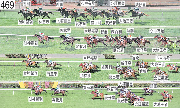 起步後不久,「威仔皇」在「莫己若」與「有意思」之間受擠迫,當時「有意思」向內斜跑。其後「威仔皇」受催策,但未能加速,首次趨近終點時在馬群之後切入。同樣於起步後不久,「威百利」向內斜跑,碰撞「大地王者」的後軀,「大地王者」因而失去平衡。「莫己若」儘管於早段受催策,但加速緩慢。 首次跑過終點時,儘管騎師已努力阻止,但「大地王者」仍將頭轉側及向內斜跑,導致「公証揚聖」勒避及失地。 跑過千四米處時,正被收慢的「大埔福星」在「有意思」與「智能」之間受擠迫,當時「智能」向外斜跑。 過了千一米處後在一段途程上,「大地王者」開始十分難以穩定走勢,在勒避「威百利」的後蹄之際向內斜跑及碰撞「公証揚聖」,「公証揚聖」因而失去平衡。 過了六百米處後轉彎時,「智能」失去平衡。其後「智能」開始失地,導致「新寵」受阻及失地。跟隨「新寵」的「心中有盈」及「公証揚聖」均因而勒避。其後「智能」持續墮退,導致「新寵」在馬群中被帶向後。 接近二百五十米處時,「威仔皇」一度在「莫己若」與「威百利」之間受擠迫,當時「威百利」向外斜跑。 在末段,「大埔福星」在「威百利」內側緊迫競跑。 直路上,「加有利」將頭轉側,而「大地王者」則內閃及難以策騎。 「加有利」大部分途程在外疊競跑,沒有遮擋。 賽後獸醫立即檢查「智能」及「新寵」,並無發現任何明顯異常之處。 「新寵」、「財神駕到」及「有意思」均須抽取樣本檢驗。