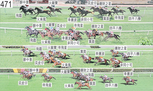 「飲食之星」入閘後煩躁不安,以後足豎立,並且將左前腳伸進隔鄰馬匹的閘廂。「飲食之星」被牽出閘廂接受獸醫檢查,獸醫表示該駒右前腳有多處擦傷,因而不適宜出賽。因此,小組按照獸醫意見著令「飲食之星」退出。考慮到「飲食之星」以往在閘廂事件方面的紀錄,小組著令「飲食之星」必須連續多次試閘及格,並且通過獸醫檢驗後,才可再次出賽。 「奀皮仔」出閘僅屬一般。 「賞面」起步時向外斜跑,碰撞「飛霞」。 「四平八穩」及「帝飛星」自外檔出閘後於早段均在馬群之後切入。 過了千一米處後轉彎時,「幸運波」與「運財之星」互相碰撞。 過了一千米處後進入對面直路時,「火乘風」靠近「飛霞」的後蹄處於窘境,繼而開始十分難以穩定走勢,並且自「飛霞」後面向外移出。過了六百米處後轉彎時,「火乘風」在跑來搶口之際再度向外移出避開「飛霞」的後蹄。 過了六百米處後轉彎時,「非同小可」走勢笨拙。 接近五百米處時,「奀皮仔」移至「火龍寶」的後蹄外側,因而與「幸運波」緊迫競跑。其後一段短途程後,「幸運波」失去平衡,向外斜跑,並且碰撞「非同小可」。 接近一百五十米處時,「飛霞」收慢避開「奀皮仔」(見習騎師吳嘉晉)的後蹄,當時「奀皮仔」在催策下將頭轉側及內閃。其後「奀皮仔」持續內閃及難以策騎。小組告誡見習騎師吳嘉晉,儘管小組認為「奀皮仔」難以策騎,但仍告誡他須盡力保持坐騎直線競跑。 賽後獸醫立即檢查「幸運波」及「飛霞」,並無發現任何明顯異常之處。 「奀皮仔」及「醉中意」均須抽取樣本檢驗。