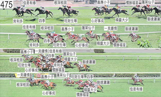 「根深柢固」起步時向外斜跑,碰撞「信是有緣」。「精靈大少」出閘笨拙。「蓬萊仙子」出閘僅屬一般,起步後不久在「心好事成」被「四季」帶向外跑之際收慢避開「心好事成」的後蹄。「一見鍾情」自外檔出閘後於早段在馬群之後切入。趨近千三米處時,「四季」在搶口之際向外斜跑,導致「旺財生暉」受阻。接近一千米處時,「蓬萊仙子」一度在「慣勝福星」內側的窄位競跑,繼而失去平衡。跑過八百米處時,「豁達瀟灑」被「慣勝福星」碰撞及帶出更外疊,當時「慣勝福星」急促向外移出避開「精靈大少」的後蹄。轉直路彎時,「蓬萊仙子」靠近「嘉應小子」的後蹄處於窘境。入直路後不久,「四季」將頭轉側,向內斜跑,並且在「肯利多」的後蹄外側處於窘境。跑過二百五十米處時,「蓬萊仙子」於正在墮退的「信是有緣」之後處於窘境,繼而向外移出避開該駒的後蹄。趨近二百米處時,「旺財生暉」略為向外斜跑,碰撞「心好事成」。「旺財生暉」其後嚴重失去平衡及進一步向外斜跑,導致「心好事成」被帶向外跑及碰撞「慣勝福星」,「慣勝福星」的騎師因而在該駒失去平衡後停止催策。接近二百米處時,「精靈大少」向外移出避開「四季」的後蹄。過了二百米處後,傾向將頭轉側及外閃的「一見鍾情」在「根深柢固」的後蹄內側處於窘境。過了一百米處後,「一見鍾情」持續外閃,在末段再度於「根深柢固」內側緊迫競跑。被查詢時,杜利萊表示,是晚他獲提供的策騎指示與上仗相同,即盡可能讓「肯利多」佔取前列位置。他說,上仗他於早段大力催策坐騎,但由於有多駒展示較「肯利多」為快的前速,導致坐騎居於領放馬之後競跑。他說,是晚他再獲指示自第十二檔出閘後將「肯利多」置於前列位置,皆因坐騎曾在領放或居於大約前列位置下勝出海外賽事。他說,根據策騎指示,他於早段催策坐騎。當首次跑過終點時,「肯利多」走大外疊。他說,因此他容許坐騎持續推進上前,過了一千米處後能夠向內移入居「信是有緣」外側競跑。他續說,其後他嘗試收慢坐騎,因為他留意到已消耗坐騎相當氣力才能佔取該位置。被查詢時,羅理雅表示,由於賽前預計是賽步速會快,因此他獲指示盡可能將「慣勝福星」置於大約中間位置。他說,他獲告知「慣勝福星」出閘並非最快,加上是賽排外檔出閘,賽前預計如果要催策負頂磅的坐騎上前,則將會於早段消耗坐騎太多力氣。他說,「慣勝福星」出閘較預期為佳,其後他確曾考慮讓坐騎展步上前,然而他留意到居坐騎內側的多駒正被大力催策,因此他選擇將「慣勝福星」於早段在馬群之後切入,並佔取「精靈大少」後面的位置,導致坐騎居於較賽前部署稍後的位置。他續說,「慣勝福星」於轉直路彎時及直路早段以佳勢上前,他認為坐騎將可以勁勢衝刺,直至於接近二百米處時因為內側馬匹向外斜跑,坐騎的步韻因而受阻。賽後獸醫立即檢查「信是有緣」,並無發現任何明顯異常之處,但由於該駒煩躁不安,因而未能替牠進行內窺鏡檢查。 「心好事成」、「根深柢固」及「一見鍾情」均須抽取樣本檢驗。