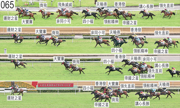 「隆鳳捌叁」入閘後十分煩躁不安,以後足豎立,導致騎師蔡明紹右腿受傷。由於蔡明紹身體不適,小組著令「隆鳳捌叁」退出。馬會醫生其後替蔡明紹檢查後認為他不適宜繼續作賽,蔡明紹因而未能履行餘下賽事的策騎聘約。「隆鳳捌叁」必須經多次試閘及格後,才可再次出賽。 躍出時,「帝國之星」及「四小福」均在「大寶庫」與「領航精神」之間受擠迫,當時「領航精神」出閘笨拙及向外斜跑。 「領先直前」自大外檔出閘後瞬即在馬群之後切入。 在中段,「齊飛」在跑來搶口時昂首。 「飛魚威威」於轉直路彎時及在直路早段急促墮退,接近二百米處時被騎師史卓豐收慢。史卓豐在坐騎倒下之前下馬。 賽後獸醫立即檢查「大寶庫」,並無發現任何明顯異常之處。 「大寶庫」、「運財之星」及「四小福」均須抽取樣本檢驗。