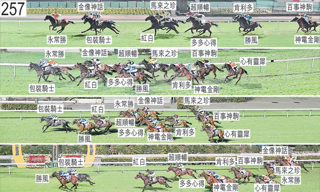 「超順暢」起步時向外斜跑,碰撞「肯利多」。 「神電金剛」及「心有靈犀」自外檔出閘後均於早段在馬群之後切入。 跑過千八米處時,「心有靈犀」在難以穩定走勢之際數度昂首。 首次跑過終點時,「紅白」在靠近「包裝騎士」的後蹄處於窘境之際向外斜跑。 鑒於賽事中段的步速,「永常勝」在過了千一米處後向外移出以繞過馬群上前領放。 過了八百米處後,「超順暢」與「多多心得」緊迫競跑。 入直路彎時,「超順暢」在「金像神話」後蹄外側處於窘境並靠近「紅白」的後蹄競跑之際失去平衡。 過了一百米處後,「包裝騎士」與「勝風」在雙雙斜跑之際互相碰撞。 「超順暢」、「勝風」及「包裝騎士」均須抽取樣本檢驗。