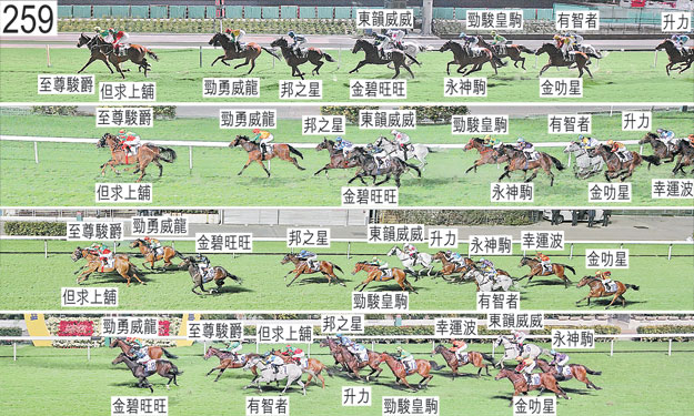 「勁駿皇駒」開閘時煩躁不安,因而出閘緩慢。 「東韻威威」出閘僅屬一般,其後不久在「勁勇威龍」與向外斜跑的「邦之星」之間受擠迫之際收慢。 「至尊駿爵」起步時在雙雙斜跑的「永神駒」及「金叻星」之間受擠迫。「金叻星」在向外移出以紓緩對「至尊駿爵」的緊迫之際碰撞「但求上舖」。 「幸運波」自大外檔出閘後於早段在馬群之後切入。 首次跑過終點時,「勁駿皇駒」推進至「東韻威威」後蹄內側空位不足之處競跑,當時「東韻威威」在「永神駒」內側緊迫競跑。此宗事件後在一段途程上,「勁駿皇駒」勒避「東韻威威」的後蹄。 趨近千二米處時,搶口的「金碧旺旺」靠近「邦之星」的後蹄處於窘境,當時「邦之星」在被收慢之際搶口。 吳嘉晉(「至尊駿爵」)承認一項不小心策騎〔賽事規例第100(1)條〕,事緣在大約一千一百五十米處,他容許坐騎在尚未帶離「邦之星」時向內斜跑,導致該駒須勒避「至尊駿爵」的後蹄,並相應導致「金碧旺旺」須大力勒避及向外斜跑壓向「永神駒」,導致「永神駒」踢中「金碧旺旺」的後蹄及幾乎跌倒。跟隨其後的「東韻威威」、「金叻星」、「勁駿皇駒」、「升力」及「幸運波」均因而嚴重受阻礙。小組判罰吳嘉晉停賽(四個香港賽馬日)直至二○一六年一月十四日星期四才可再次出賽。此項停賽罰則押後至十二月二十七日星期日沙田賽事後執行。小組告誡吳嘉晉,在衡量罰則時,小組考慮了他在此宗事件中高度不小心,以及其騎法所造成的後果。 過了六百米處後轉彎時,「至尊駿爵」與「但求上舖」緊迫競跑。 跑過四百米處時,「東韻威威」在挨擦內欄後失去平衡。在「東韻威威」失去平衡之際,「勁駿皇駒」向外移出避開該駒的後蹄,導致「永神駒」被帶出更外疊。跟隨其後的「有智者」向外移出避開「永神駒」的後蹄,導致「金叻星」被帶出更外疊。 賽後獸醫立即檢查「金叻星」,並無發現任何明顯異常之處。 「勁勇威龍」及「金碧旺旺」均須抽取樣本檢驗。