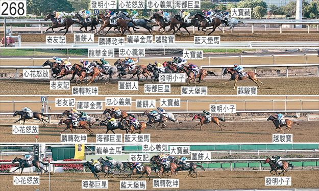 「海紅寶」於賽日早上被小組按照獸醫意見(左前腿脛部腫脹)著令退出。「海紅寶」必須通過獸醫檢驗後,才可再次出賽。「薑餅人」出閘僅屬一般。「龍華金馬」與「老友記」起步時互相碰撞。起步後不久,「龍華金馬」在「老友記」與「麟轉乾坤」之間緊迫競跑,當時「麟轉乾坤」將頭轉側及外閃。「海都巨星」及「大寶藏」自外檔出閘後均於早段在馬群之後切入。「藍天堡馬」於早段走外疊,跑過一千米處時在馬群之後切入以佔取較接近內欄的有遮擋位置。接近七百五十米處轉彎時,「發明小子」收慢避開「薑餅人」的後蹄,當時儘管騎師已盡力阻止但「薑餅人」仍將頭轉側及向內移入避開「老友記」,此時「老友記」則同樣向內斜跑。由於此宗事件不涉及騎師犯錯,因此小組不採取進一步行動。過了七百米處後轉彎時,「龍華金馬」在外疊競跑,沒有遮擋。被查詢時,霍勵賢表示,賽前他獲指示讓「發明小子」於早段居前競跑,並盡可能佔取內欄位置。他說,「心花怒放」排第一檔出閘,「發明小子」則排在其隔鄰檔位,賽前覺得「發明小子」具備足夠速度超越「心花怒放」。他說,根據策騎指示,他於早段的一段途程上催策坐騎以帶離「心花怒放」,然而該駒出閘十分迅速,在坐騎內側走勢強勁。他說,他不認為持續催策「發明小子」是合理騎法,因為他不相信坐騎具備足夠速度,能在毋須長途程大力催策下超越「心花怒放」,而這樣做會令坐騎在末段無法以勁勢衝刺。他說,因此他於趨近八百米處時決定繼續在「心花怒放」外側競跑。被查詢有關「麟轉乾坤」於早段的騎法時,鄭雨滇表示,賽前他獲指示讓坐騎居中間之前位置競跑,但避免於早段推策坐騎,因為坐騎於上仗作賽時於早段受催策後在末段轉弱。他說,他獲得進一步指示,早段僅能讓坐騎以天生前速取位。他說,根據策騎指示,他容許出閘迅速的「麟轉乾坤」佔取前列位置。他說,賽前他覺得「老友記」將主宰賽事步速,當時「老友記」在「麟轉乾坤」外側競跑,因此他於賽事早段將注意力集中在該駒身上。他說,因此他沒有即時把握機會讓「麟轉乾坤」繞至「發明小子」外側。他又說,「薑餅人」於九百米處前能夠推進至「麟轉乾坤」內側,「麟轉乾坤」因而於大部分途程上在沒有遮擋下走外疊。小組告誡鄭雨滇,他策騎「麟轉乾坤」的方式已引起小組關注,而他於此階段的騎法有可能令他被指控違反一項嚴重的賽事規例。小組嚴厲譴責鄭雨滇,並告誡他,他必須確保其策騎方式不會令坐騎不必要地多走腳程並把握當下出現的最佳競賽位置。賽後,獸醫應練馬師李易達的要求替「越駿寶」進行內窺鏡檢查。獸醫說,是項檢查顯示該駒的氣管內有很多血。「越駿寶」必須通過獸醫檢驗後,才可再次出賽。「心花怒放」及「海都巨星」均須抽取樣本檢驗。
