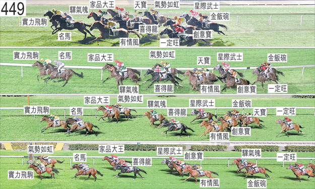 「星際武士」出閘十分笨拙,其後不久在「驛氣魄」內側受擠迫,當時「驛氣魄」被「天寳」碰撞後向內斜跑。起步後不久,「喜得龍」向著外側的「實力飛駒」的後蹄斜跑,當時「實力飛駒」正在向內斜跑。「金飯碗」自外檔出閘後於早段在馬群之後切入。「創意寶」同樣自外檔出閘後於早段收慢,向內移入以取得遮擋。跑過九百米處時,「氣勢如虹」一度在「驛氣魄」的後蹄內側處於窘境,當時「驛氣魄」向內斜跑。過了六百米處後轉彎時,「驛氣魄」稍微向外斜跑,導致「喜得龍」被帶出更外疊。「有情風」因而向外移出避開「喜得龍」的後蹄。接近四百五十米處時,「天寳」在「氣勢如虹」與「喜得龍」(郭能)之間緊迫競跑之際勒避,當時「喜得龍」一度向內斜跑。跟隨其後的「創意寶」因而勒避該駒的後蹄。小組認為鑒於「喜得龍」向內斜跑的程度僅屬輕微,因而沒有足夠證據向郭能提出不小心策騎的指控,但仍須嚴厲譴責郭能,並告誡他,日後須確保給予內側馬匹足夠的競賽空間。「實力飛駒」及「氣勢如虹」均須抽取樣本檢驗。