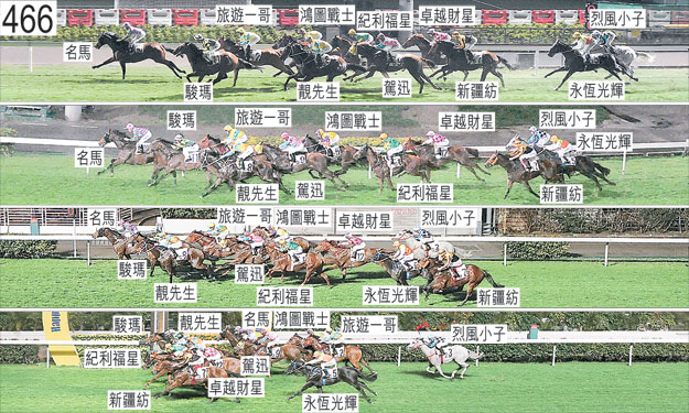 抵達起步點後,郭能表示對「旅遊一哥」的動作有疑慮。「旅遊一哥」接受獸醫檢查,經過必要的診視後,獸醫認為該駒適宜出賽。「卓越財星」出閘笨拙。「永恆光輝」出閘僅屬一般。起步後不久,「駕迅」被「旅遊一哥」碰撞後向外斜跑,並碰撞「靚先生」的後軀,「靚先生」因而失去平衡。趨近首個彎位時,「駕迅」向內斜跑及碰撞「新疆紡」。跑過九百米處時,「紀利福星」在靠近「旅遊一哥」的後蹄處於窘境之際昂首。同樣於跑過九百米處時,「駕迅」一度在「靚先生」內側處於窘境,當時「靚先生」向內斜跑避開「駿瑪」的後蹄。跑過四百五十米處時,「靚先生」被「駕迅」碰撞後軀時失去平衡,當時「駕迅」嘗試在「靚先生」與「駿瑪」之間推進。其後一段短途程後,「駕迅」在「靚先生」與「駿瑪」之間無路可上之際失地,「紀利福星」其後收慢避開「駕迅」的後蹄。轉直路彎時,「鴻圖戰士」在「旅遊一哥」之後嚴重受困而未能望空,並以圖在「旅遊一哥」與「駕迅」之間推進,當時該處空位不足,導致「鴻圖戰士」碰撞「駕迅」的後軀,「駕迅」因而失去平衡。跑過三百米處時,「鴻圖戰士」在「旅遊一哥」與「駕迅」之間無路可上之際收慢後移至「旅遊一哥」內側,當時「旅遊一哥」向外斜跑,而「駕迅」則在「靚先生」內側緊迫競跑。由於小組認為「鴻圖戰士」尚未在「旅遊一哥」與「駕迅」之間充分確立跑線,因此不採取進一步行動。跑過二百五十米處時,「卓越財星」靠近「駕迅」的後蹄處於窘境。跑過二百米處時,「卓越財星」收慢以移至「紀利福星」外側。跑過一百米處時,「紀利福星」在催策下向外斜跑,「卓越財星」因而靠近該駒的後蹄處於窘境。接近終點時,「旅遊一哥」在「鴻圖戰士」與「駕迅」(黎海榮)之間受擠迫之際勒避,當時「鴻圖戰士」稍微向外斜跑,而「駕迅」則在催策下向內斜跑。小組嚴厲譴責黎海榮,並告誡他日後須加倍小心。被查詢時,羅理雅表示,賽前預期排在有利檔位出閘的「鴻圖戰士」能夠居於大約第五或第六位。他說,「鴻圖戰士」展現偏快前速,轉入對面直路時能夠佔取領放馬「名馬」之後的位置。他說,他本來打算保持在「旅遊一哥」內側及「名馬」之後的位置,然而,過了七百米處後轉彎時,「鴻圖戰士」脫口並在當時狀況下顯得不完全自在。他說,他於接近六百五十米處時以右手鞭打坐騎的肩膀以圖讓「鴻圖戰士」保持位置,並阻止「旅遊一哥」向內斜跑。他說,他認為若要在「名馬」之後保持位置,便須在這時候大力催策「鴻圖戰士」,因為儘管被鞭打肩膀,坐騎仍未能保持位置。他又說,他不相信在這時候大力催策坐騎是符合牠最佳利益的做法,因此他選擇讓「旅遊一哥」於接近五百米處時超越「鴻圖戰士」。他說,他認為能讓「鴻圖戰士」有最大機會以勁勢衝刺的做法是不讓牠在中段脫口。小組告誡羅理雅,儘管小組接納他在接近六百五十米處時鞭打坐騎的肩膀,但小組認為他應作出更大努力以保持位置,因為當時乃賽事關鍵階段。小組告誡羅理雅,只要情況許可,他的騎法須確保坐騎能夠保持在有利位置。賽後獸醫立即檢查「全力」,發現該駒右後足系部有一處細小的割傷。「全力」包尾大敗而回,小組認為該駒的表現難以接受。「全力」必須試閘及格,以及通過獸醫檢驗後,才可再次出賽。被查詢有關「駿瑪」的進步表現時,其練馬師徐雨石表示,他從「駿瑪」上仗的表現看出此駒在馬匹之間競跑時頗為膽怯,有鑒於此,此駒今仗由見習騎師黃皓楠策騎,他相信此駒有機會在負輕磅下爭奪領先。他說,他預期若「駿瑪」能在是賽中領放,此駒表現或會較佳。「駿瑪」及「紀利福星」均須抽取樣本檢驗。