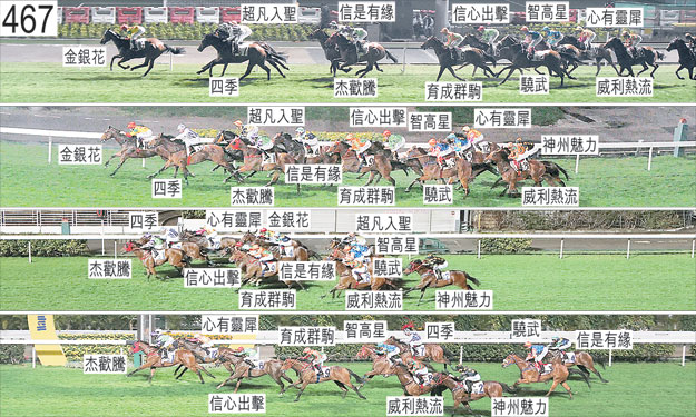 「金銀花」躍出時向外斜跑,碰撞「驍武」。 「威利熱流」及「神州魅力」自外檔出閘後均於早段在馬群之後切入。 跑過千六米處時,「智高星」在「育成群駒」與「超凡入聖」之間受擠迫之際收慢,當時「超凡入聖」被「金銀花」(見習騎師黃皓楠)帶向內跑,「金銀花」繼而向外移出以紓緩緊迫。小組譴責黃皓楠。 趨近千三米處時,「心有靈犀」一度在「威利熱流」內側受擠迫,當時「威利熱流」向內移入避開「智高星」的後蹄,「智高星」則在「驍武」內側緊迫競跑。 過了千二米處後,「驍武」在外疊競跑,沒有遮擋。 趨近九百米處轉彎時,「超凡入聖」收慢避開「金銀花」的後蹄。 跑過八百米處時,「神州魅力」起初嘗試在「威利熱流」外側推進,並在「威利熱流」向外移至第三疊位置之際收慢及在該駒之後向內移入。 跑過四百五十米處時,由於「神州魅力」嘗試向外移出以望空,因而與「威利熱流」緊迫競跑。轉直路彎時,「神州魅力」繼而在「威利熱流」與「智高星」之間緊迫競跑,當時「智高星」向外斜跑。「神州魅力」因而受困而未能望空直至接近二百米處,此時該駒向外移出橫越「威利熱流」的後蹄。 進入直路時,由於「智高星」嘗試向外移出以望空,因而與「驍武」緊迫競跑。「智高星」繼而未能望空直至接近二百米處。 跑過一百米處時,「心有靈犀」開始在催策下向外斜跑,接近五十米處時向內移入避開「杰歡騰」的後蹄。賽後獸醫立即檢查「神州魅力」及「信是有緣」,並無發現任何明顯異常之處。「神州魅力」、「杰歡騰」及「心有靈犀」均須抽取樣本檢驗。