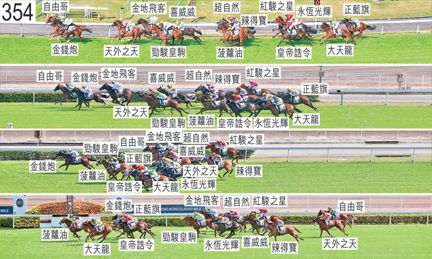 進入跑道後,杜利萊被「永恆光輝」拋下,「永恆光輝」在鞍上無人下前行了一段短途程後被捉回,人馬無恙。「自由哥」起步時向上跳躍,出閘僅屬一般。「超自然」出閘僅屬一般,其後不久在「辣得寶」與「皇帝誥令」之間受擠迫,當時「皇帝誥令」被「金錢炮」帶向內跑,儘管騎師已努力阻止,但「金錢炮」仍將頭轉側及向內斜跑。在此宗事件中,「辣得寶」被「超自然」碰撞後軀之際嚴重失去平衡,而「皇帝誥令」在「金錢炮」內側受擠迫之際亦受阻礙。「大天龍」、「菠蘿油」及「紅駿之星」自外檔出閘後均於早段在馬群之後切入。跑過千二米處時,「菠蘿油」在勒避「金錢炮」的後蹄之際在一段途程上開始十分難以穩定走勢及昂首。過了千一米處後,「金錢炮」在沒有遮擋下走外疊,並獲許展步上前居領放馬外側。過了九百米處後轉彎時,「辣得寶」及「菠蘿油」均走勢笨拙。轉直路彎時,「超自然」外閃。直路早段,「永恆光輝」難以望空。「金地飛客」在直路早段一段不短的途程上受困而未能望空,跑過二百米處時在「自由哥」內側望空後將頭轉側、外閃及未能全力施為。小組認為「金地飛客」的走勢難以接受。「金地飛客」必須試閘及格後,才可再次出賽。趨近及跑過三百五十米處時在一段途程上,「紅駿之星」在推進至「超自然」內側的窄位之際受困而未能望空。跑過三百米處時,由於「皇帝誥令」及「大天龍」雙雙斜跑,兩駒因而互相碰撞。其後,「大天龍」在催策下內閃,趨近一百五十米處時向內斜跑及挨擦「皇帝誥令」。跑過二百五十米處時,「紅駿之星」再次受困而未能望空。末段,「皇帝誥令」在雙雙斜跑的「大天龍」與「菠蘿油」之間緊迫競跑。「皇帝誥令」因而未能全力施為。「勁駿皇駒」大部分途程在外疊競跑,沒有遮擋。「皇帝誥令」、「菠蘿油」及「大天龍」均須抽取樣本檢驗。