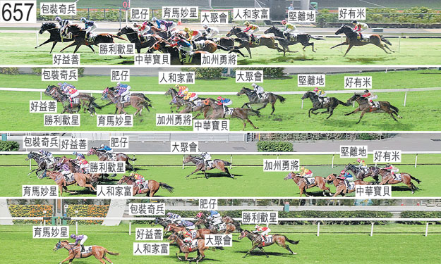 「好有米」入閘後煩躁不安,就在開閘前將頭轉向左方,因而出閘緩慢。 「堅離地」同樣出閘緩慢。「中華寶貝」躍出時向外斜跑,因而失地。跑過一百米處時,「好有米」向外斜跑避開「加州勇將」的後蹄,並且妨礙「中華寶貝」。「勝利歡星」沿途在外疊競跑,沒有遮擋。何澤堯(「加州勇將」)及見習騎師黃皓楠(「中華寶貝」)均被查詢於早段及中段的騎法。何澤堯表示,他獲指示讓「加州勇將」上前,盡可能領放,但倘若有機會佔取領放馬之後的位置,則應佔取該位置。他說,他於早段將「加州勇將」置於前列位置競跑,當他發現有四駒爭奪領先時,他收慢「加州勇將」,以確定是否能居於領先馬匹之後的位置。然而,當他這樣做時,在他內側走第四疊的「大聚會」被收慢及向內移回以佔取「勝利歡星」之後的第三疊位置。因此坐騎在沒有遮擋下走第四疊,由於他並不認為仍可佔取領先馬匹之後的位置,他遂催策坐騎上前,希望能超越「勝利歡星」,「勝利歡星」於過了九百米處後正被騎師收慢。然而當他推進至「勝利歡星」外側時,該駒在「加州勇將」內側推進,令他未能切入,被迫收慢坐騎及在「勝利歡星」之後向內移入。見習騎師黃皓楠表示,由於「中華寶貝」上仗於居後競跑下表現未達預期,他今仗獲明確指示自大外檔出閘後帶頭競跑。他說,根據策騎指示,他於早段大力催策「中華寶貝」,但坐騎加速緩慢。他於首次轉彎時持續催策「中華寶貝」,並按照指示爭取前列位置。然而,「中華寶貝」未能展現足夠的速度超越內側的馬匹,於對面直路上在沒有遮擋下走大外疊,瞬即須受催策。小組告誡見習騎師黃皓楠,儘管小組理解他嘗試執行策騎指示,但在今次的情況中,他應在遠未到六百米處前就停止催策坐騎上前,至少須尋求機會嘗試佔取較接近內欄的位置,從而讓其坐騎有更大機會於末段以勁勢衝刺。賽後獸醫立即檢查「威力名城」,並無發現任何明顯異常之處。「威力名城」包尾大敗而回,小組認為該駒的表現難以接受。「威力名城」必須試閘及格,並且通過獸醫檢驗後,才可再次出賽。「肥仔」、「育馬妙星」及「人和家富」均須抽取樣本檢驗。