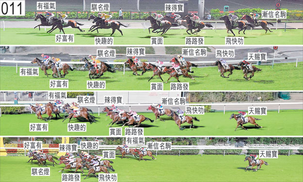 在亮相圈時,「泡泡達人」煩躁不安,並且踢中欄杆。抵達起步點後,「泡泡達人」接受獸醫檢查,獸醫表示該駒右後蹄球節內側部位有一處割傷,因而不適宜出賽。小組按照獸醫意見著令「泡泡達人」退出。「泡泡達人」必須通過獸醫檢驗後,才可再次出賽。「天賜寶」在閘內十分煩躁不安,數度將頭低俯,開閘時再度將頭低俯,因而出閘緩慢。「漸信名駒」出閘緩慢。「飛快叻」出閘僅屬一般,其後在「好富有」與「辣得寶」之間受擠迫之際失地,當時「辣得寶」向外斜跑。起步後不久,由於「路路發」及「快趣的」雙雙斜跑,「路路發」因而一度收慢避開「快趣的」的後蹄。接近一千米處轉彎時,居於領放馬外側在沒有遮擋下走外疊的「快趣的」收慢以佔取「好富有」之後的位置。跑過七百米處時,「路路發」在「賞面」之後處於窘境之際昂首。接近五百五十米處轉彎時,「飛快叻」在「漸信名駒」與「路路發」之間緊迫競跑,當時「路路發」在靠近「賞面」的後蹄處於窘境後向外斜跑。「騏名燈」於直路早段起初嘗試佔取「好富有」與「有福氣」之間的位置,趨近二百米處時該位置因該兩駒斜跑而逐漸消失,「騏名燈」因而移至「好富有」外側。「騏名燈」取位以在「好富有」外側推進後,過了二百米處後在一段短途程上由於「好富有」在催策下向外斜跑,「騏名燈」因而靠近該駒的後蹄處於窘境。趨近一百米處時,「快趣的」被向外斜跑的「騏名燈」挨擦,接近七十五米處時被該駒碰撞。在此宗事件中,「辣得寶」向外斜跑避開「快趣的」,並且阻礙「賞面」。被查詢有關「天賜寶」的差劣表現時,莫雷拉表示,坐騎入閘後十分煩躁不安,開閘時將頭低俯後失地。他說,在早段他力策「天賜寶」以推進,坐騎儘管於早段及中段沿途受力策,但未能展步,不肯自馬群尾列上前。他說,過了六百米處後,他持續大力催策「天賜寶」時得以略為追前,他將坐騎移至馬群外側,希望坐騎能以更暢順的走勢展開衝刺。他續說,儘管如此,「天賜寶」跑來持續欠缺鬥心,全程未能上前。賽後獸醫立即檢查「天賜寶」,並無發現任何明顯異常之處,但由於該駒煩躁不安,因而未能替牠進行內窺鏡檢查。「天賜寶」為是賽大熱門,小組認為該駒的閘廂行為及表現均難以接受。「天賜寶」必須試閘及格,並且通過獸醫檢驗後,才可再次出賽。「天賜寶」、「好富有」及「騏名燈」均須抽取樣本檢驗。