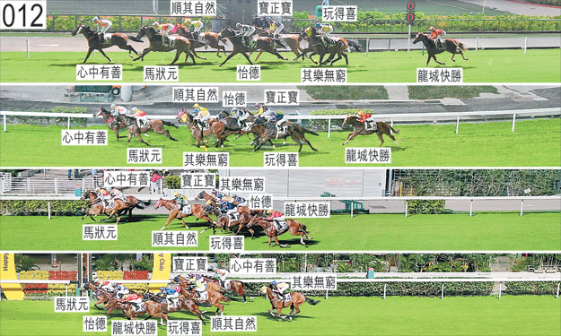「玩得喜」出閘笨拙。「怡德」出閘笨拙,向內斜跑及碰撞「寶正寶」。「龍城快勝」自大外檔出閘後於早段收慢,在馬群之後切入。過了千三米處後,「順其自然」在收慢讓「心中有善」超越時在該駒的後蹄內側處於窘境。過了九百米處後,「其樂無窮」向外移出,並受催策以推進,其後在沒有遮擋下走外疊。跑過七百米處時,「順其自然」一度靠近「心中有善」的後蹄處於窘境。趨近及跑過四百米處時,「怡德」在「其樂無窮」與「順其自然」之間的窄位競跑時不願保持位置,當時「順其自然」將頭轉側及向著「馬狀元」的後蹄外閃。其後轉直路彎時,「怡德」收慢避開「順其自然」(李寶利)的後蹄,當時「順其自然」在尚未帶離之際向外斜跑。小組告誡李寶利,在類似情況下轉換跑線時必須加倍小心。趨近一百五十米處時,「其樂無窮」在「怡德」與「玩得喜」之間緊迫競跑,當時「玩得喜」向內斜跑。被查詢時,練馬師呂健威表示,他曾指示李寶利須確保「順其自然」出閘迅速,而且賽前預期在是賽出賽馬匹不多下,該駒應可佔取大約中間位置。李寶利表示,在出閘迅速後,他於起步後不久便開始將坐騎向內移近內欄,然而當數駒居其內側時,他選擇繼續超越該等馬匹,然後留住「順其自然」及讓「心中有善」超越。他說,這導致「順其自然」較一般情況下居於更前的位置競跑。呂健威表示,由於是晚賽事的形勢,「順其自然」居於較他預期為前的位置,而他打算日後讓該駒採取較留後的跑法,即保持該駒以往勝出時的跑法。「玩得喜」、「馬狀元」及「怡德」均須抽取樣本檢驗。