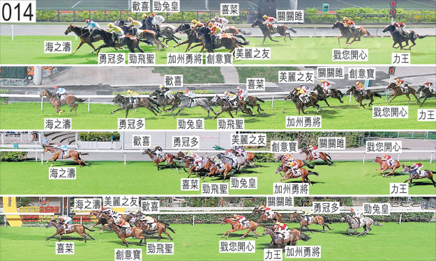 「戥您開心」及「力王」均出閘僅屬一般。「加州勇將」躍出時在「美麗之友」與「勁飛聖」之間受擠迫,當時「勁飛聖」向外斜跑。在此宗事件中,「加州勇將」碰撞「美麗之友」,其後「美麗之友」在「海之濤」內側受擠迫。接近九百五十米處時,「美麗之友」收慢避開「海之濤」(見習騎師巫顯東)的後蹄,當時「海之濤」向內斜跑。小組告誡見習騎師巫顯東必須加倍小心。接近八百五十米處時,「美麗之友」及「創意寶」均在外疊競跑後收慢以佔取較近內欄的位置。趨近七百米處時,「勁飛聖」向著外側的「海之濤」的後蹄斜跑,當時「海之濤」稍微向內斜跑。這導致「勁飛聖」於跑過七百米時靠近「海之濤」的後蹄嚴重處於窘境,並急促向內斜跑及碰撞「勁兔皇」,「勁兔皇」因而失去平衡。小組告誡見習騎師巫顯東,儘管「勁飛聖」起初向著外側的「海之濤」的後蹄斜跑是造成此宗事件的原因,但他在轉換跑線時必須確保已充分帶離對手。過了六百米處後,「勁飛聖」在外疊競跑,沒有遮擋。接近五百五十米處轉彎時,「創意寶」一度在「美麗之友」的後蹄內側緊迫競跑。入直路時,「勁飛聖」被「喜菜」挨擦,當時「喜菜」向外移出以望空。趨近二百米處時,傾向內閃的「勁兔皇」靠近「勇冠多」的後蹄處於窘境,當時「勇冠多」向外斜跑。接近終點時,「戥您開心」失去平衡。賽後郭能報告,「加州勇將」發出異常呼吸聲。賽後獸醫立即檢查「加州勇將」,並無發現任何明顯異常之處。賽後獸醫立即檢查「勁兔皇」,並無發現任何明顯異常之處。「勁飛聖」、「喜菜」及「海之濤」均須抽取樣本檢驗。