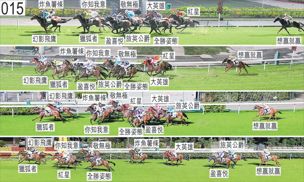 「炸魚薯條」起步時向內斜跑,並且碰撞「大英雄」,「大英雄」相應向內斜跑,並且碰撞「盈喜悅」的後軀。「紅星」及「全勝姿態」自外檔出閘後均於早段收慢,在馬群之後切入。趨近八百米處時在一段途程上,「大英雄」勒避「旅英公爵」的後蹄。趨近八百米處時,「全勝姿態」開始搶口,在勒避「盈喜悅」的後蹄之際昂首,「盈喜悅」沿途在沒有遮擋下走外疊。「獵狐者」於轉直路彎時將頭轉側及外閃。 「旅英公爵」於直路早段靠近「盈喜悅」的後蹄處於窘境,接近二百五十米處時移至該駒內側以圖推進至「盈喜悅」與「大英雄」之間的窄位。在此宗事件中,「旅英公爵」與「大英雄」互相碰撞,兩駒因而雙雙失去平衡,「旅英公爵」在「盈喜悅」與「大英雄」之間無路可上之際收慢。 被查詢時,楊明綸表示,他獲指示讓「炸魚薯條」佔取前列位置,但不一定要帶頭。他說,他於早段催策坐騎以超越內側馬匹,過了一千米處後能夠取得領先,但隨即受到推進至其外側的「幻影飛鷹」施壓。他說,「幻影飛鷹」持續與「炸魚薯條」並跑,由於坐騎以往在草地千二米賽事曾疑有後勁不繼之跡象,他遂選擇讓「幻影飛鷹」過頭,沒有繼續嘗試與該駒爭持。他覺得此舉可讓「炸魚薯條」獲最佳機會於末段以勁勢衝刺。他續說,過了五百米處後被「幻影飛鷹」超越後,「炸魚薯條」走勢穩定,於直路早段略有反應,其後於賽事較後階段轉弱。 賽後獸醫報告,「獵狐者」流鼻血。 「獵狐者」及「幻影飛鷹」均須抽取樣本檢驗。