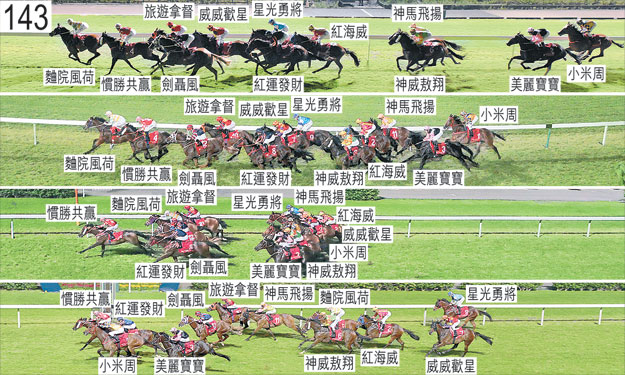 「星光勇將」出閘笨拙,其後不久被「紅海威」碰撞,當時「紅海威」向內斜跑。「威威歡星」起步時向內斜跑,碰撞「神馬飛揚」。起步後不久,「美麗寶寶」(貝湯美)在「神威敖翔」與「劍聶風」之間受擠迫之際收慢,當時儘管騎師已努力阻止,但「劍聶風」仍向內斜跑。賽後,貝湯美報告,他於賽前打算讓「美麗寶寶」置於前列位置競跑,然而在此宗事件上失地後,他選擇將「美麗寶寶」在馬群之後切入以取得遮擋。儘管於早段受力策,「劍聶風」未能展現前速,首次趨近終點時收慢以圖佔取有遮擋的位置,然而須在沒有遮擋下走外疊。過了千一米處後,「劍聶風」獲許推進至較前的位置,但持續在沒有遮擋下走外疊。「小米周」於早段在收慢收取得遮擋。首次跑過終點時在一段途程上,「星光勇將」在勒避「旅遊拿督」的後蹄之際十分難以穩定走勢,數度昂首。趨近千一米處時,「星光勇將」勒避「旅遊拿督」的後蹄,當時「旅遊拿督」靠近「麯院風荷」的後蹄處於窘境。跟隨「星光勇將」的「神馬飛揚」因而受妨礙。「小米周」於過了千二米處時在搶口之際昂首。進入直路後不久,「紅海威」與「神馬飛揚」互相碰撞。趨近二百米處時,「紅海威」在「神馬飛揚」與「威威歡星」之間緊迫競跑。接近一百五十米處時,「神威敖翔」一度收慢避開「美麗寶寶」的後蹄,當時「美麗寶寶」向內斜跑。在一段短途程後,衝刺強勁的「小米周」在靠近「紅運發財」的後蹄處於窘境後向外移出避開該駒的後蹄。小組譴責貝湯美,並告誡他必須盡力保持坐騎直線競跑。接近一百五十米處,由於「紅海威」居「神馬飛揚」外側競跑,「神馬飛揚」在未能移至「麯院風荷」外側後移至該駒內側以圖望空。一段短途程後,「神馬飛揚」在「麯院風荷」與「旅遊拿督」之間頗為難以望空。接近終點時,「威威歡星」向外移出避開「紅海威」的後蹄。獸醫於賽後立即檢查「紅海威」,發現該駒右後腿不良於行。「紅海威」必須通過獸醫檢驗後,才可再次出賽。獸醫於賽後立即檢查「神威敖翔」,並無發現任何明顯異常之處。 「紅海威」、「慣勝共贏」及「小米周」均須抽取樣本檢驗。