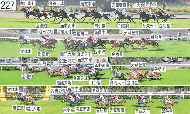起步後不久,「飛雲寶」在「天賦致寶」與「滿載而來」之間緊迫競跑,當時「滿載而來」向內斜跑。「育成天下」、「金叻星」及「架勢堂」自外檔出閘後均於早段在馬群之後切入。跑了一段短途程後,「電訊大炮」及「金錢炮」均在「育成天下」與「跑出彩虹」之間受擠迫,當時「跑出彩虹」向外斜跑。趨近千一米處時,「滿貫中環」在靠近「金禧足球」的後蹄處於窘境之際昂首。過了千一米處後,「滿載而來」在收慢以讓「金錢炮」過頭時昂首。 過了一千米處後,「滿載而來」在「金錢炮」之後跑來搶口。六百米處,由於「電訊大炮」向外移出以在「飛雲寶」之後推進,因而與「育成天下」緊迫競跑。過了六百米處後,「滿載而來」靠近「金錢炮」的後蹄處於窘境。接近五百五十米處時,「滿貫中環」在「金禧足球」之後處於窘境。在直路早段,「滿載而來」在催策下將頭轉側及內閃。「滿載而來」其後持續將頭轉側。獸醫於賽後立即檢查「天賦致寶」及「金叻星」,並無發現任何明顯異常之處。「金錢炮」及「飛雲寶」均須抽取樣本檢驗。