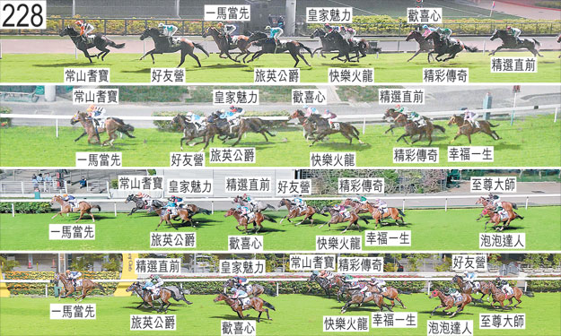 就在開閘前,「皇家魅力」煩躁不安,其後開閘時一對前腳並舉,因而出閘緩慢。「歡喜心」躍出時向外斜跑及碰撞「精選直前」,當時「精選直前」向外斜跑及與「快樂火龍」互相觸碰,三駒因而失去平衡。跑了一段短途程後,「歡喜心」在「精選直前」與「精彩傳奇」之間受擠迫,當時「精彩傳奇」向外斜跑。「泡泡達人」及「至尊大師」自外檔出閘後均於早段在馬群之後切入。同樣自外檔出閘的「幸福一生」於早段收慢以取得遮擋。過了五百米處後轉彎時,「好友營」將頭轉側及外閃。跑過三百米處時,「好友營」(郭能)將頭轉側及急促向內斜跑,因而須勒避「旅英公爵」的後蹄。其後,「好友營」在墮退之際持續內閃。郭能於賽後報告,坐騎今仗初出,全程走勢稚嫩,在直路彎前已須受催策。他說,「好友營」在持續走勢稚嫩之際在直路上顯著轉弱。獸醫於賽後立即檢查「好友營」,並無發現任何明顯異常之處。小組認為「好友營」的走勢及表現均難以接受。「好友營」必須在轉彎途程上試閘及格,並且通過獸醫檢驗後,才可再次出賽。趨近一百米處時,「精彩傳奇」在「好友營」內側緊迫競跑,當時「好友營」內閃。獸醫於賽後立即檢查「快樂火龍」,並無發現任何明顯異常之處。 「一馬當先」及「旅英公爵」均須抽取樣本檢驗。
