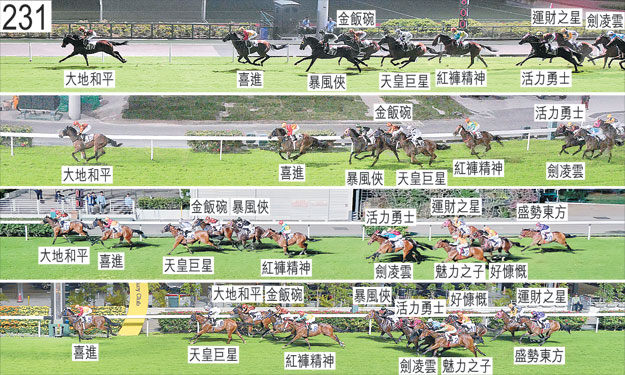 「盛勢東方」及「運財之星」躍出時均於「喜進」與「天皇巨星」之間受擠迫,當時「天皇巨星」在催策下將頭轉側及向內斜跑。「暴風俠」與「好慷慨」於起步時互相碰撞。其後自外檔出閘的該兩駒均於早段在馬群之後切入。同樣自大外檔出閘的「魅力之子」於早段收慢及在馬群之後切入以嘗試取得遮擋,但大部分途程在沒有遮擋下走外疊。見習騎師潘明輝(「大地和平」)承認一項不小心策騎〔賽事規例第100(1)條〕,事緣在接近一千一百五十米處時,他容許坐騎在尚未帶離「天皇巨星」時向內斜跑,導致該駒受阻礙及被帶向內跑橫越「盛勢東方」應有的跑線,「盛勢東方」因而須勒避並失蹄。此外,他容許坐騎於接近千一米處時在尚未帶離「喜進」時向內斜跑,導致該駒在被「大地和平」碰撞時受阻礙,並相應向內斜跑壓向「金飯碗」,導致「金飯碗」嚴重受阻礙。在此宗事件中,「活力勇士」在「金飯碗」內側受擠迫時亦受阻礙。小組判罰見習騎師潘明輝由十二月六日星期三開始停賽,直至十二月十一日星期一才可再次出賽(兩個香港賽馬日)。此外,見習騎師潘明輝被罰款三萬元。 接近一千米處轉彎時,「盛勢東方」在靠近「運財之星」的後蹄處於窘境之際昂首。 過了六百米處後轉彎時,「運財之星」在「活力勇士」的後蹄內側處於窘境。 被查詢時,見習騎師潘明輝表示,他獲指示自不利檔位出閘後催策「大地和平」上前並取得遮擋,希望該駒能佔取中間之前或領先馬匹之後的位置。他說,根據策騎指示,他於早段將「大地和平」置於前列競跑,但毋須大力催策坐騎。他說,鑒於賽事早段的形勢,坐騎在「喜進」外側競跑,居於遠較預期為前的位置。他說,過了一千米處後「喜進」被騎師收慢,因此他讓「大地和平」持續移向內欄。他說,「大地和平」在領放下跑來搶口,他嘗試在不與坐騎鬥力下收慢牠。他說,儘管「大地和平」帶離馬群一段頗長距離,但他並不認為此時的步速太快,但無論如何,由於「大地和平」在領放下搶口,他未能進一步收慢坐騎以靠近主馬群。 獸醫於賽後立即檢查「劍凌雲」,內窺鏡檢查顯示該駒的氣管內有很多血。「劍凌雲」必須通過獸醫檢驗後,才可再次出賽。「金飯碗」、「喜進」及「天皇巨星」均須抽取樣本檢驗。