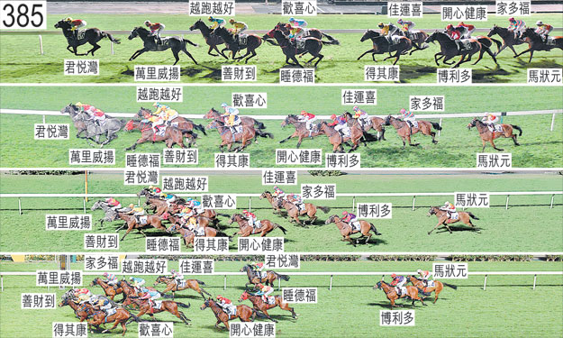 「馬狀元」出閘笨拙。「歡喜心」於起步時向外斜跑,碰撞「佳運喜」。「佳運喜」自外檔出閘後收慢以取得遮擋,其後不久昂首。同樣自外檔出閘的「歡喜心」及「家多福」均於早段收慢,在馬群之後切入。跑過千四米處時,跑來搶口的「睡德福」收慢避開「善財到」(何澤堯)的後蹄,當時「善財到」在尚未充分帶離時向內斜跑。小組嚴厲譴責何澤堯,並告誡他,在類似情況下轉換跑線時須確保已充分帶離。跟隨「睡德福」的「得其康」因而在收慢避開該駒的後蹄之際昂首,並向閃,導致「歡喜心」受擠迫。在此宗事件後,「睡德福」開始十分難以穩定走勢,在勒避「善財到」的後蹄之際昂首。跑過千二米處時,「睡德福」在靠近「善財到」的後蹄處於窘境之際稍微向外斜跑,導致「得其康」推進至「睡德福」內側緊迫競跑。過了千二米處後,「得其康」在「睡德福」稍微向內移回之際收慢。趨近千一米處時,「馬狀元」在勒避「開心健康」的後蹄之際昂首。過了千一米處後在一段不短的途程上,「睡德福」持續十分難以穩定走勢,跑過九百米處向外斜跑,及由於跑來搶口,而在未能保持居「善財到」之後的位置時避開該駒的後蹄。其後,「睡德福」走外疊,沒有遮擋。跑過六百米處時,「善財到」稍微向內斜跑,碰撞「越跑越好」,兩駒因而雙雙失去平衡。趨近一百米處時在一段途程上,「歡喜心」(蔡明紹)在嘗試推進至在催策下向外斜跑的「萬里威揚」(吳嘉晉)外側之際,在該駒之後處於窘境。跑過一百米處時,「歡喜心」在「萬里威揚」與「善財到」之間無路可上時收慢。小組告誡吳嘉晉,儘管小組認為「歡喜心」從未於「萬里威揚」外側確立跑線,但無論如何,在類似情況下他須盡全力阻止坐騎斜跑。在無路可上後,「歡喜心」向外移出避開「善財到」的後蹄,而「善財到」則向外斜跑,導致「睡德福」須收慢。小組告誡蔡明紹,儘管小組接納他於「善財到」的後蹄處於窘境,但無論如何,在類似情況下嘗試推進時,他須確保已充分帶離。當楊明綸(「佳運喜」)自左手改以右手握鞭時,他的馬鞭一度被韁繩纏著,導致楊明綸於接近一百五十米處時右邊韁繩脫手。楊明綸於餘下途程未能重拾右邊韁繩。獸醫於賽後立即檢查「睡德福」及「博利多」,並無發現任何明顯異常之處。 「得其康」、「善財到」及「萬里威揚」均須抽取樣本檢驗。