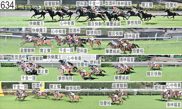 「越跑越好」於五月八日被小組按照獸醫意見(右前腿不良於行)著令退出,並由後備馬匹「寶正寶」(何澤堯)補上。「越跑越好」必須通過獸醫檢驗後,才可再次出賽。「勁豐裕」出閘緩慢。「夢想飛翔」於起步後不久收慢以取得遮擋。儘管於早段受催策,但「寶正寶」仍未能加速。過了千四米處後,「肇慶威威」走外疊,沒有遮擋。跑過八百五十米處時,「港林福星」在靠近「醒目快駒」的後蹄處於窘境之際昂首。趨近六百米處時,「寶正寶」(何澤堯)在上前超越「肇慶威威」之際急促向內斜跑,導致「肇慶威威」在「醒目快駒」與「寶正寶」之間被碰撞及受擠迫之際勒避。儘管小組認為何澤堯已立即就「寶正寶」突然向內斜跑作出反應,並已盡力將「寶正寶」向外移出以紓緩對「肇慶威威」造成的緊迫,但仍告誡他,在催策坐騎時須加倍小心,以留意坐騎是否有斜跑傾向。跑過六百米處時,「塑料喜」在「醒目快駒」與「心中有善」之間緊迫競跑,當時「心中有善」嘗試向外斜跑。跑過五百米處時,「港林福星」收慢及向外斜跑避開「醒目快駒」的後蹄,當時「醒目快駒」急促墮退。「醒目快駒」其後包尾大敗而回。小組認為「醒目快駒」的表現難以接受。「醒目快駒」必須試閘及格,並且通過獸醫檢驗後,才可再次出賽。跟隨「港林福星」的「勁豐裕」因而向外移出避開該駒的後蹄。趨近四百米處時,「港林福星」在「醒目快駒」與「肇慶威威」之間推進,導致持續墮退的「醒目快駒」向外斜跑避開「夢想飛翔」,「港林福星」因而受擠迫。接近一百五十米處時,「港林福星」與「肇慶威威」互相碰撞。獸醫於賽後立即檢查「肇慶威威」、「塑料喜」及「港林福星」,並無發現任何明顯異常之處。「千金一諾」及「型酒杯」均須抽取樣本檢驗。