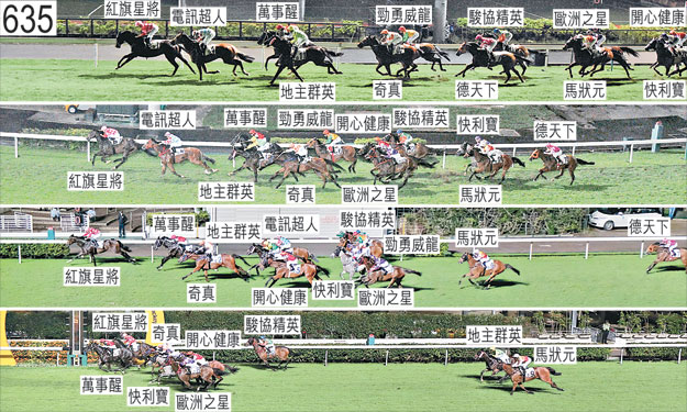 「萬事醒」於起步時向外斜跑,碰撞「馬狀元」。「駿協精英」出閘僅屬一般。「快利寶」及「開心健康」自外檔出閘後均於早後在馬群之後切入。接近千六米處時,「德天下」向內斜跑及碰撞「奇真」。何澤堯(「地主群英」)承認一項不小心策騎〔賽事規例第100(1)條〕,事緣在首次跑過終點時,他在催策坐騎之際容許坐騎在尚未充分帶離「德天下」時向內斜跑,導致該駒不必要地受擠迫及阻礙,並須收慢避開「地主群英」的後蹄。小組判罰騎師何澤堯由五月三十日星期三開始停賽,直至六月四日星期一才可再次出賽(兩個香港賽馬日)。在衡量罰則時,小組考慮了騎師何澤堯的良好策騎紀錄。接近千三米處時在收慢以取得遮擋之際,「德天下」難以穩定走勢及數度昂首。趨近二百五十米處時,「勁勇威龍」在嘗試於「電訊超人」與「地主群英」(何澤堯)之間推進之際大力勒避,當時「地主群英」向內斜跑。「勁勇威龍」在大力勒避之際,觸碰「電訊超人」及「地主群英」的後軀,兩駒因而雙雙失去平衡。「地主群英」其後向外斜跑,並須一度避開「奇真」的後蹄。由於小組認為「勁勇威龍」並無在「電訊超人」與「地主群英」之間確立跑線,因此並無採取進一步行動,但仍提醒何澤堯,他有責任盡力避免坐騎避跑。「勁勇威龍」其後被其騎師收慢,包尾大敗而回。考慮了「勁勇威龍」受到干擾的嚴重程度,小組並無對該駒採取進一步行動。獸醫於賽後立即檢查「勁勇威龍」,並無發現任何明顯異常之處。「駿協精英」於直路上在催策下將頭轉側及內閃。「德天下」大敗而回,小組認為該駒的表現難以接受。「德天下」必須試閘及格,並且通過獸醫檢驗後,才可再次出賽。被查詢時,莫雷拉(「歐洲之星」)表示,他於賽前獲指示如常將坐騎置於前列競跑。他說,「歐洲之星」出閘欠佳,其後儘管於早段受催策,但未能加速,並於起步後不久被「德天下」超越。他說,「歐洲之星」其後未能展現前速,並居於遠較賽前預期為後的位置。被查詢有關「電訊超人」令人失望的表現時,李寶利表示,他認為首次在跑馬地上陣的「電訊超人」未能應付跑馬地賽事。「電訊超人」最近在沙田勝出一場賽事時,較是晚容易佔取前列位置。他說,在是晚賽事中,他須在一段途程上催策坐騎以佔取前列位置,但於首次跑過終點時讓「紅旗星將」超越「電訊超人」後,他能將「電訊超人」切入以居該駒外側競跑,而坐騎於中段走勢良佳。他又說,「電訊超人」於過了五百米處後受催策,其後於末段未能以勁勢衝刺。他說,「電訊超人」目前僅得三歲,在此階段尚未成熟。獸醫於賽後立即檢查「電訊超人」,並無發現任何明顯異常之處。「奇真」、「萬事醒」及「紅旗星將」均須抽取樣本檢驗。