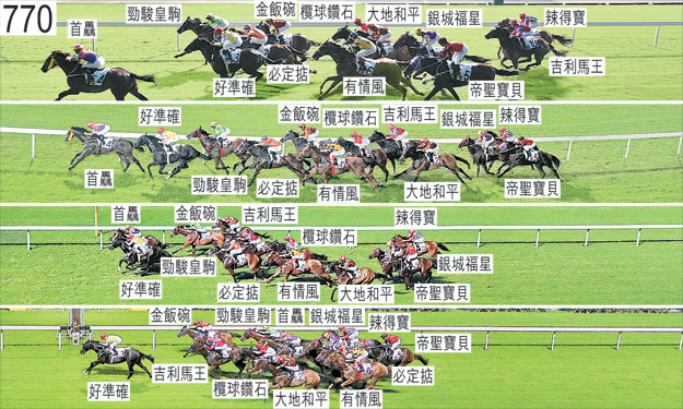 抵達起步點時,「辣得寶」重新裝上右前蹄的蹄鐵。「辣得寶」接受獸醫檢查,獸醫認為該駒適宜出賽。「銀城福星」出閘僅屬一般,其後儘管受催策,但未能加速。「吉利馬王」與「帝聖寶貝」於起步時互相碰撞,兩駒因而雙雙失去平衡。「吉利馬王」繼而在「帝聖寶貝」與「有情風」之間受擠迫。自外檔出閘的「吉利馬王」及「帝聖寶貝」其後均於早段在馬群之後切入。躍出時,「欖球鑽石」在雙雙斜跑的「金飯碗」與「必定掂」之間受擠迫之際失地。在此宗事件中,「金飯碗」及「必定掂」均被「欖球鑽石」觸碰後軀,兩駒繼而雙雙失去平衡。跑過八百米處時,「欖球鑽石」在「金飯碗」外側的窄位競跑,當時「金飯碗」在「勁駿皇駒」的後蹄外側處於窘境之際收慢,而「勁駿皇駒」則向外斜跑。過了六百米處後,「大地和平」一度收慢避開「有情風」的後蹄,當時「有情風」向內斜跑。跟隨其後的「銀城福星」因而在「大地和平」之後處於窘境之際昂首。跑過五百米處時,「辣得寶」在「銀城福星」內側的窄位競跑。趨近二百五十米處時,「欖球鑽石」靠近「必定掂」的後蹄處於窘境。跑過二百五十米處時,「金飯碗」一度在「勁駿皇駒」內側的窄位競跑。一百五十米處,「帝聖寶貝」向內斜跑避開「有情風」的後蹄,並碰撞「銀城福星」。趨近一百米處時,「欖球鑽石」在「吉利馬王」的後蹄外側處於窘境。五十米處,「必定掂」被「有情風」碰撞,當時「有情風」在「大地和平」(黃皓楠)內側受擠迫之際向內斜跑,而「大地和平」則向內斜跑,繼而向外移出以紓緩對「有情風」及「必定掂」的緊迫。小組譴責黃皓楠,並告誡他有責任在坐騎開始斜跑時立即停止催策並修正坐騎。在末段,「銀城福星」在「首驫」的後蹄外側緊迫競跑。同樣在末段,「辣得寶」在「勁駿皇駒」的後蹄外側處於窘境,因而未能被力策至終點。「有情風」沿途在沒有遮擋下走外疊。「金飯碗」、「好準確」及「吉利馬王」均須抽取樣本檢驗。