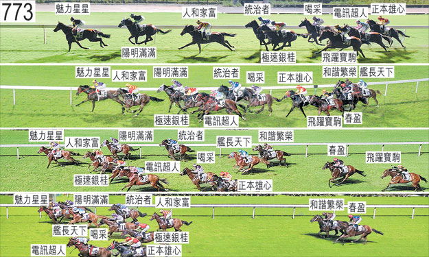 「金碧輝煌」於七月三日被小組按照獸醫意見(左前腿不良於行)著令退出,並由後備馬匹「陽明滿滿」(何澤堯)補上。「金碧輝煌」必須通過獸醫檢驗後,才可再次出賽。「人和家富」於起步時向外斜跑,碰撞「正本雄心」。「正本雄心」、「和諧繁榮」及「艦長天下」自外檔出閘後均於早段收慢,在馬群之後切入。儘管於早段受力策,但「春盈」未能加速,因而於跑過千一米處時在馬群之後切入以取得遮擋。跑過七百米處時,「正本雄心」靠近「喝采」的後蹄處於窘境。過了六百米處後轉彎時,「陽明滿滿」向外斜跑,碰撞「人和家富」的後軀,兩駒因而雙雙失去平衡。跑過四百五十米處時,「春盈」在「飛躍寶駒」與「正本雄心」(沈拿)之間受擠迫之際勒避,當時「正本雄心」迅速推進至靠近「喝采」的後蹄,並因而須移離該駒的後蹄,繼而向外斜跑。由於小組認為「正本雄心」向外斜跑是由於該駒在「喝采」之後迅速推進所致,而非沈拿於當時有意圖地將坐騎向外移出,小組遂選擇不向他提出不小心策騎的指控,然而小組告誡沈拿,他須確保在類似情況下盡全力阻止坐騎斜跑及造成干擾。「正本雄心」於此宗事件中失去右前蹄的蹄鐵。跑過二百米處時,「喝采」起初移至「電訊超人」內側,繼而移至「極速銀桂」內側以望空。「飛躍寶駒」沿途在沒有遮擋下走外疊。賽後,田泰安被「魅力星星」拋下,人馬無恙。 小組押後宣佈覆磅完畢,以判斷「電訊超人」是否有確實負磅至終點。小組確定,「電訊超人」於接近終點時有不妥,導致騎師蘇狄雄嚴重失去平衡。小組進一步確定,蘇狄雄在衝線時被拋下之際與「電訊超人」仍有接觸,而且沒有任何身體部位觸碰地面。由於小組認為「電訊超人」有確實負磅至終點,遂宣佈覆磅完畢並確定評判員宣佈的名次。當「電訊超人」有不妥時,「正本雄心」於衝線時受阻礙。儘管蘇狄雄因在此宗事件中受傷而未能於賽後覆磅,但小組認為沒有跡象顯示「電訊超人」沿途的負重低於正確的負磅。因此,小組引用賽事規例第112(5)條賦予的權力,在蘇狄雄毋須進行覆磅下宣佈覆磅完畢。獸醫於賽後應練馬師方嘉柏的要求替「極速銀桂」進行內窺鏡檢查。獸醫報告,是項檢查顯示該駒的氣管內有很多血。「極速銀桂」必須通過獸醫檢驗後,才可再次出賽。獸醫於賽後立即檢查「人和家富」,並無發現任何明顯異常之處。「魅力星星」及「陽明滿滿」均須抽取樣本檢驗。「電訊超人」亦須抽取樣本檢驗。