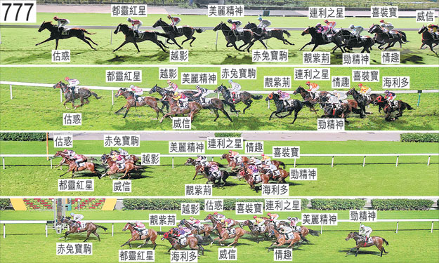 「海利多」及「威信」自外檔出閘後均於早段收慢,在馬群之後切入。儘管於早段受催策,但「靚紫荊」加速需時。趨近千二米處時,「赤兔寶駒」將頭轉側,向著「美麗精神」的後蹄外閃。跑過五百米處時,「喜裝寶」在「連利之星」之後受困之際在該駒之後處於窘境。「喜裝寶」其後於轉直路彎時及直路早段難以望空,跑過二百米處時向內移入避開「美麗精神」的後蹄以望空。趨近四百米處時,由於「威信」繞過「美麗精神」推進,「美麗精神」因而靠近「都靈紅星」的後蹄處於窘境。接近終點時,「海利多」將頭轉側及內閃。被查詢時,吳嘉晉(「勁精神」)表示,由於是晚有數匹賽駒以往曾於陣上佔取前列位置,他認為今仗賽事步速會偏快。他說,因此他獲指示自外檔出閘後盡可能佔取大約中間或中間之前位置。他說,他於躍出時留意到居其外側的「美麗精神」正受力策,而由於居其內側的「赤兔寶駒」正在收慢,他遂將「勁精神」切入以佔取中間位置。他說,然而由於各駒所分佈的位置,他未能向內移入至第三疊或更接近內欄的位置,因而沿途在沒有遮擋下走外疊。被查詢時,沈拿表示,他於早段將「威信」置於馬群後列競跑後,他於跑過七百米處時選擇開始繞過「勁精神」推進。他說,儘管此時賽事步速中等,但他認為在是晚各場賽事中居後列的賽駒均難以追前,因此他認為最佳的選擇是於此時開始推進,以免在較後時間須自後列追前。他又說,儘管「威信」於最後一百米未能以勁勢衝刺,他認為這並非由於他自七百米處起開始催策坐騎所致,而是由於坐騎自上週三作賽後尚未恢復體力,皆因他認為坐騎似乎在有充分休息時方能交出最佳表現。獸醫於賽後立即檢查「喜裝寶」、「連利之星」及「美麗精神」,並無發現任何明顯異常之處。獸醫於賽後立即檢查「情趣」,並無發現任何明顯異常之處,但由於該駒煩躁不安,因而未能替牠進行內窺鏡檢查。「估惑」、「赤兔寶駒」及「都靈紅星」均須抽取樣本檢驗。