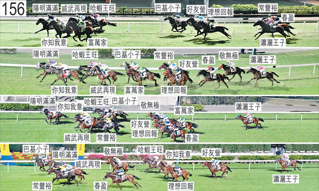 「春盈」於躍出時急促向內斜跑,導致「敬無極」受擠迫。「陽明滿滿」於起步後不久向外斜跑,碰撞「好友營」。「常豐裕」自大外檔出閘後於早段在馬群之後切入。「瀟灑王子」於過了一千米處後轉彎時走外疊,繼而收慢以取得遮擋。「富萬家」於早段在一段途程上受催策以佔取前列位置,繼而在沒有遮擋下走外疊,因而於過了九百米處後在一段途程上收慢以跟隨「你知我意」。「富萬家」起初在「你知我意」之後取得遮擋,過了六百米處後再度在沒有遮擋下走外疊。趨近六百米處時,「好友營」在「巴基小子」與「理想回報」之間的窄位競跑。在此宗事件中,「好友營」碰撞「巴基小子」的後軀,「巴基小子」因而失去平衡。跑過三百米處及接近二百米處時,「巴基小子」兩度在「哈蝦王旺」的後蹄內側處於窘境,當時「哈蝦王旺」向內斜跑。接近二百五十米處時,「好友營」一度收慢避開「常豐裕」的後蹄,當時「常豐裕」向外移出以望空。被查詢有關「理想回報」令人失望的表現時,利敬國表示,賽前他獲指示盡可能讓坐騎居於中間位置。他說,「理想回報」出閘笨拙,其後不久在「你知我意」的後蹄內側處於窘境。他說,這導致「理想回報」居於較賽前希望為後的位置。他說,他於早段催策坐騎以嘗試佔取中間位置,並於接近一千米處時持續催策坐騎以免牠被「瀟灑王子」過頭。他說,儘管「理想回報」得以佔取中間位置,但須消耗較賽前希望為多的力氣才能做到。他說,「理想回報」於跑過四百米處時移至「富萬家」外側後未能如他預計般加速,末段衝刺僅屬一般。他又說,他認為坐騎表現令人失望可歸咎於牠在早段已受催策,情況與坐騎上仗於早段留後競跑後衝刺強勁不同。獸醫於賽後立即檢查「理想回報」,並無發現任何明顯異常之處。獸醫於賽後立即檢查「富萬家」及「你知我意」,並無發現任何明顯異常之處。「理想回報」、「巴基小子」及「常豐裕」均須抽取樣本檢驗。