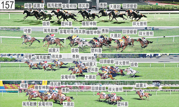 「得其康」出閘笨拙,因而失地。起步後不久,「紫電明珠」在「威震天」與「埼豐」之間緊迫競跑,當時「埼豐」向外斜跑。「蒜頭爺爺」及「祥光普照」自外檔出閘後均於早段在馬群之後切入。跑了一段短途程後,「盛勢」及「大運起」均於「蒜頭爺爺」與「勇駒」之間受擠迫,當時「勇駒」向外斜跑。在此宗事件中,「蒜頭爺爺」被「大運起」碰撞時失去平衡。跑過二百五十米處時,「祥光普照」在「盛勢」內側緊迫競跑,當時「盛勢」在墮退時內閃。「祥光普照」於跑過一百五十米處時在「蒜頭爺爺」的後軀外側緊迫競跑。接近二十五米處時,向外移出以圖在「萬馬歡騰」外側上前的「勇駒」在「萬馬歡騰」與「機智神駒」之間無路可上時收慢,當時「萬馬歡騰」向外斜跑。在此宗事件中,「勇駒」碰撞「機智神駒」。由於小組認為「勇駒」在「萬馬歡騰」斜跑前尚未在該駒外側確立跑線,因此不採取進一步行動。「機智神駒」及「勇駒」均因這宗事件而未能被力策至終點。「盛勢」沿途在沒有遮擋下走外疊。被查詢有關「塑料喜」的表現時,蔡明紹表示,賽前他預期是賽步速偏快,並將主要由「紫電明珠」、「盛勢」及「威震天」主宰步速,因此他期望馬群能於早段分散競跑,讓自外檔出閘的他有機會佔取有遮擋的位置。他說,他按照策騎指示於早段將「塑料喜」置於前列競跑,但儘管在一段途程上受催策,「塑料喜」仍未能展現如「盛勢」般的前速,他因而選擇於首次跑過終點時佔取該駒之後有遮擋的位置。他說,「塑料喜」於中段走勢暢順,接近四百米處時移至「盛勢」外側後,鑒於「塑料喜」沿途的走勢,他認為坐騎將加速良佳。他又說,然而「塑料喜」立即脫口,儘管於直路上受力策,但僅能保持同速,於末段未能以勁勢衝刺,表現令人失望。獸醫於賽後立即檢查「塑料喜」,並無發現任何明顯異常之處。 被查詢有關「祥光普照」的表現時,蘇兆輝表示,自大外檔出閘後,他於早段在馬群之後切入,一如坐騎以往的跑法。他說,「祥光普照」沿途走勢一般,根據坐騎以往的表現,他預期坐騎於直路早段能加速良佳。他說,他打算於跑過四百米處時移至「大運起」外側,但他認為這樣做需多走太多腳程,而由於該駒內側存在空位,他遂於直路早段在馬匹之間上前。他說,「祥光普照」加速未如他預期般快,其後起初在「盛勢」與「蒜頭爺爺」之間競跑,繼而於直路上在「塑料喜」與「蒜頭爺爺」之間競跑,但「祥光普照」不願在馬匹之間上前。他又說,「祥光普照」是賽表現令人失望,尤其是其加速力不及上仗由另一騎師策騎上陣般快。獸醫於賽後立即檢查「祥光普照」,並無發現任何明顯異常之處。獸醫於賽後立即檢查「威震天」,並無發現任何明顯異常之處,但由於該駒煩躁不安,因而未能替牠進行內窺鏡檢查。「埼豐」及「萬馬歡騰」均須抽取樣本檢驗。