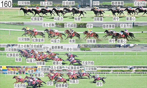 「好計」於起步時向外斜跑,碰撞「合拍威龍」。「勤德兼備」與「將令」於起步時互相大力觸碰,兩駒因而雙雙嚴重失去平衡。「有獎」與「川河領駒」於起步時互相碰撞。「有獎」其後向內斜跑,碰撞「爪皇烈焰」。起步後不久,「紅旗星將」在「好計」內側緊迫競跑後向內斜跑,因而碰撞「活力名駒」的後軀,「紅旗星將」及「活力名駒」因而雙雙失去平衡。「爪皇烈焰」及「歡喜心」自外檔出閘後均於早段在馬群之後切入。「將令」儘管於早段受催策,但未能加速。跑過千二米處時,「活力名駒」靠近「川河領駒」的後蹄競跑。過了三百米處後,「合拍威龍」移至「川河領駒」內側以嘗試推進至該駒與「活力名駒」之間的窄位。趨近二百米處時,「合拍威龍」(韋達)在「活力名駒」與「川河領駒」之間無路可上之際大力勒避,當時「川河領駒」稍微向內斜跑。小組認為,由於在「川河領駒」稍微向內斜跑,該駒與「活力名駒」之間並無空位,「合拍威龍」遂未能在該兩駒之間確立跑線,因此不採取進一步行動。然而,小組告誡韋達,嘗試在馬匹之間疑似空位不足處推進時須小心。「勤德兼備」於跑過二百米處時受困而未能望空,跑過一百米處時向外移出數疊以取位。跑過五十米處時,正在墮退的「川河領駒」在「紅旗星將」與「合拍威龍」之間一度受擠迫之際收慢。「叫座力」在直路上於催策下內閃及難以策騎,跑過一百米處時向內斜跑及碰撞「紅旗星將」的後軀。被查詢有關「紅旗星將」的表現時,田泰安表示,坐騎出閘僅屬一般,由於自外檔出閘的「川河領駒」前速較快,坐騎未能單騎領放。他說,坐騎陣上走勢僅屬一般,直路上受催策時未能以勁勢衝刺,表現令人失望。他又說,以坐騎的走勢來看,他認為坐騎上仗在快步速賽事中受催策領放,可能導致坐騎是晚尚未恢復體力。獸醫於賽後立即檢查「紅旗星將」,並無發現任何明顯異常之處。獸醫於賽後立即檢查「川河領駒」,並無發現任何明顯異常之處。「紅旗星將」、「放眼量」及「爪皇烈焰」均須抽取樣本檢驗。