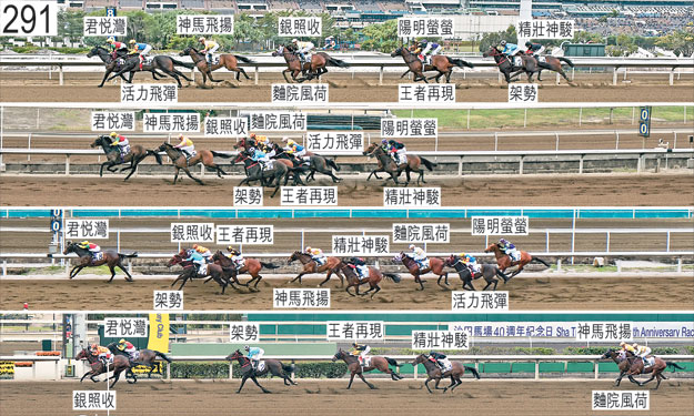 「精壯神駿」於起步時失蹄,繼而在「王者再現」外側受擠迫之際失地,當時「王者再現」被「陽明螢螢」帶向外跑。在此宗事件中,「銀照收」被「精壯神駿」碰撞後軀後失去平衡。 過了千四米處後,「陽明螢螢」在搶口時昂首。同樣在過了千四米處後,「架勢」收慢避開「王者再現」的後蹄,當時「王者再現」收慢以讓「麯院風荷」超越, 其後在該駒之後一度處於窘境。轉直路彎時,「王者再現」與「架勢」緊迫競跑。趨近二百米處時,「王者再現」在「架勢」的後蹄內側緊迫競跑,當時「架勢」在催策下將頭轉側及內閃。接近一百五十米處時,「王者再現」一度收慢避開「銀照收」的後蹄,當時「銀照收」向外斜跑。被查詢時,蔡明紹表示,他獲指示讓「活力飛彈」佔取前列位置,並盡可能領放。他說,他獲解釋,「活力飛彈」是匹均速馬,因此若能主宰步速將有利坐騎。他說,「活力飛彈」在閘內躁動不安,出閘笨拙及失地,因而於早段居於馬群後列競跑。起步後跑了一段短途程後被「架勢」超越後,「活力飛彈」在該駒之後處於窘境,他認為他必須收慢「活力飛彈」才能繼續居於該駒之後。當他注意到「神馬飛揚」居於「活力飛彈」前方外疊競跑時,他選擇於轉彎時繞過「架勢」上前以跟隨「神馬飛揚」。他說,「神馬飛揚」持續上前居於領放馬外側,導致「活力飛彈」在沒有遮擋下走第三疊直至過了千二米處。他續說,有見及此,他讓「活力飛彈」持續上前以切入,於過了八百米處後居於領放馬「君悅灣」外側。他說,接近七百米處轉彎時,「活力飛彈」須受催策,開始外閃,但他覺得此時「活力飛彈」未能專注競跑,皆因該駒已在中段受催策上前以致乏力。其後,「活力飛彈」儘管受催策,但毫無反應,於轉直路彎時顯著轉弱。賽後,獸醫應練馬師蘇偉賢的要求替「麯院風荷」進行內窺鏡檢查。獸醫報告,是項檢查顯示該駒的氣管內有很多血。「麯院風荷」必須通過獸醫檢驗後,才可再次出賽。「架勢」、「銀照收」及「君悅灣」均須抽取樣本檢驗。