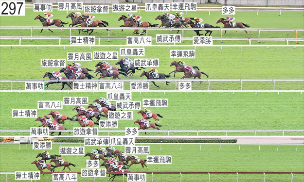 「幸運飛駒」出閘僅屬一般。「威武承傳」出閘緩慢,其後在收慢避開「遨遊之星」的後蹄之際受阻礙,當時「遨遊之星」急促向外斜跑。 「愛添勝」與「舞士精神」於起步時互相碰撞。「愛添勝」其後向外斜跑,妨礙「多多」。「爪皇轟天」於躍出時嚴重失蹄。跑過六百米處時,「幸運飛駒」向內移入避開「爪皇轟天」的後蹄。接近三百五十米處時,走勢稚嫩的「多多」失去平衡。跑過三百米處時,「遨遊之星」向內斜跑避開「霽月高風」的後蹄,導致「威武承傳」受妨礙。過了三百米處後,「霽月高風」將頭轉側及內閃。接近一百五十米處時,「霽月高風」收慢避開「愛添勝」(潘明輝)的後蹄,當時「愛添勝」在催策下向外斜跑,其後被修正。小組譴責潘明輝,並告誡他在類似情況下應較今次更快停止催策及修正坐騎。獸醫於賽後立即檢查「萬事叻」,並無發現任何明顯異常之處。「舞士精神」及「愛添勝」均須抽取樣本檢驗。
