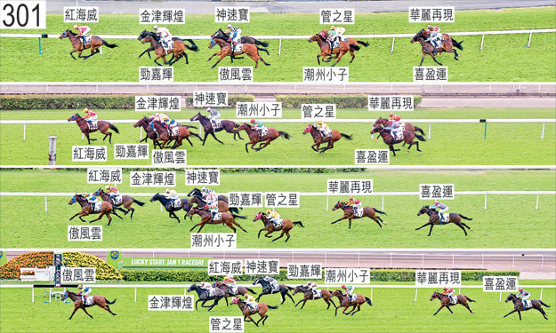 開閘時,「管之星」以後足豎立,因而失地。接近千四米處時,「勁嘉輝」在沒有遮擋下走外疊,跑過千二米處時受催策以佔取較接近內欄的較前位置。接近九百米處轉彎時,「管之星」向外斜跑,碰撞「潮州小子」。跑過一百米處時,「神速寶」向內移入避開「紅海威」的後蹄,接近五十米處時一度在該駒內側處於窘境。獸醫於賽後立即檢查「喜盈運」,並無發現任何明顯異常之處,但由於該駒煩躁不安,因而未能替牠進行內窺鏡檢查。獸醫於賽後立即檢查「潮州小子」,內窺鏡檢查顯示該駒的氣管內有很多血。「潮州小子」必須通過獸醫檢驗後,才可再次出賽。「傲風雲」及「金津輝煌」均須抽取樣本檢驗。