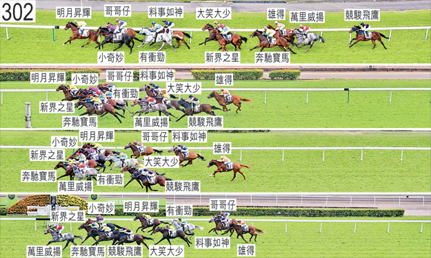 「新界之星」出閘笨拙。「奔馳寶馬」及「萬里威揚」自外檔出閘後均於早段在馬群之後切入。「哥哥仔」與「有衝勁」於起步時互相碰撞。跑了一段短途程後,「雄得」向內斜跑及碰撞「哥哥仔」的後軀,兩駒因而雙雙失去平衡。「雄得」其後向外斜跑,導致「競駿飛鷹」一度在「新界之星」內側緊迫競跑。接近千四米處時,「大笑大少」在收慢避開「有衝勁」的後蹄之際昂首。六百米處,「奔馳寶馬」被「萬里威揚」碰撞後軀,當時「萬里威揚」在「奔馳寶馬」與「大笑大少」之間的窄位競跑,而「大笑大少」則向外斜跑。跑過六百米處時,「萬里威揚」在「新界之星」之後處於窘境。接近三百五十米處時,「有衝勁」在「小奇妙」與「新界之星」之間受擠迫,當時「新界之星」被「奔馳寶馬」(莫雷拉)帶向內跑,而內閃的「奔馳寶馬」則向內斜跑,繼而被修正。小組譴責莫雷拉,並告誡他,小組認為他應較今次更早修正坐騎。見習騎師巫顯東(「雄得」)因對已無爭逐機會的馬匹不必要地用鞭而遭小組譴責。小組告誡見習騎師巫顯東,若他短期內再犯同樣錯誤,小組將採取進一步行動。賽後,「雄得」被發現右後軀有一處腫脹。獸醫報告,他認為腫脹成因與見習騎師巫顯東用鞭無關。「奔馳寶馬」、「萬里威揚」及「新界之星」均須抽取樣本檢驗。