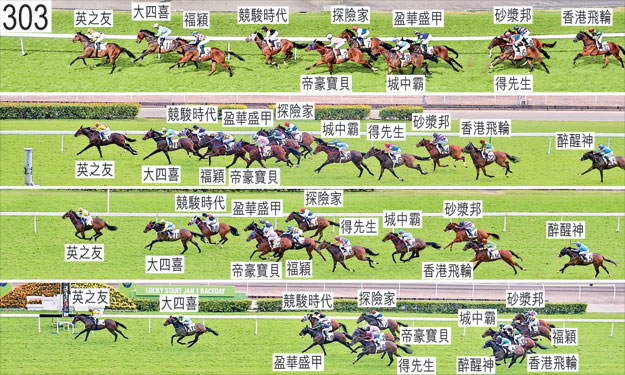 「得先生」在閘內煩躁不安及數度以後足豎立。「得先生」必須經閘廂測試及格後,才可再次出賽。「探險家」出閘緩慢,繼而向著外側的「大四喜」的後蹄斜跑。「大四喜」於起步時向外斜跑,妨礙「盈華盛甲」及出閘笨拙的「砂漿邦」。「醉醒神」出閘僅屬一般,躍出時在「城中霸」與「香港飛輪」之間受擠迫,當時「香港飛輪」急促向內斜跑。「香港飛輪」及「得先生」自外檔出閘後均於早段在馬群之後切入。跑過一千米處時,「盈華盛甲」一度在「城中霸」內側緊迫競跑,當時「城中霸」向內斜跑,繼而急促向外移出以紓緩對「盈華盛甲」的緊迫。其後,「城中霸」在沒有遮擋下走外疊。同樣於跑過一千米處時,「香港飛輪」靠近「得先生」的後蹄處於窘境。接近一百米處時,「砂漿邦」向內移入避開「福穎」的後蹄,當時「福穎」正在墮退。賽後,「得先生」據報左前臂有一處輕微擦傷。「城中霸」於賽後失去左前蹄的蹄鐵。獸醫於賽後立即檢查「福穎」,並無發現任何明顯異常之處。「得先生」、「英之友」及「大四喜」均須抽取樣本檢驗。