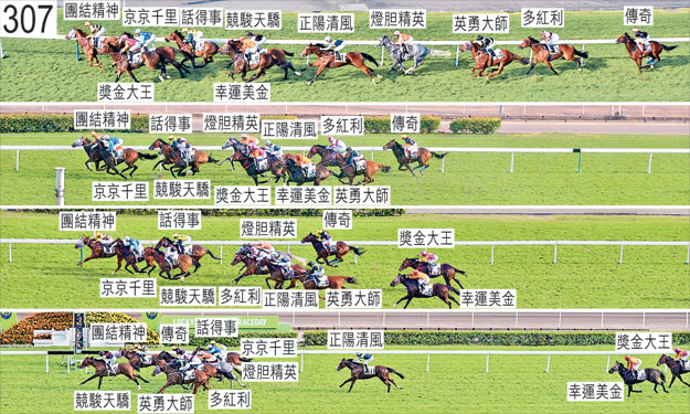 「團結精神」於起步時向外斜跑,碰撞「幸運美金」。「傳奇」自外檔出閘後於早段收慢,在馬群之後切入以取得遮擋。接近九百米處轉彎時,「幸運美金」將頭轉側及向著「獎金大王」的後蹄外閃。跑過九百米處時,「正陽清風」一度靠近「幸運美金」的後蹄處於窘境。「燈胆精英」受困而未能望空直至接近三百米處。過了三百米處後,「英勇大師」向外斜跑,碰撞「幸運美金」。趨近一百米處時,「傳奇」向外移出避開「話得事」的後蹄以繼續上前。「傳奇」其後於末段在「燈胆精英」內側緊迫競跑。「話得事」於直路上全程未能望空,因而未能施為。「獎金大王」沿途在沒有遮擋下走外疊,直路上墮退。被查詢時,巴度表示,「勇者勝」於早段及中段前肢動作感覺十分僵硬。他說,他於起步後不久嘗試催策坐騎上前以佔取較接近馬群的位置,因為坐騎於早段被拋離。「勇者勝」儘管受催策,但未能推進,直至入直路後很久其動作才開始放鬆起來。他又說,「勇者勝」於直路較後段略為追前,但仍居包尾位置過終點。獸醫於賽後立即檢查「勇者勝」,並無發現任何明顯異常之處,但由於該駒煩躁不安,因而未能替牠進行內窺鏡檢查。「勇者勝」大部分途程被拋離,小組認為該駒的表現難以接受。「勇者勝」必須試閘及格,並且通過獸醫檢驗後,才可再次出賽。獸醫於賽後立即檢查「正陽清風」,並無發現任何明顯異常之處,但由於該駒煩躁不安,因而未能替牠進行內窺鏡檢查。獸醫於賽後立即檢查「幸運美金」,證實該駒患有「喘鳴症」,而該駒過往亦有此毛病報告。賽後,獸醫應練馬師沈集成的要求替「競駿天驕」進行內窺鏡檢查。獸醫報告,是項檢查顯示該駒的氣管內有很多血。「競駿天驕」必須通過獸醫檢驗後,才可再次出賽。「競駿天驕」及「團結精神」均須抽取樣本檢驗。