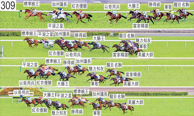 「美麗大師」出閘緩慢。「當家精選」於起步時向外斜跑,阻礙「軍歌」。起步後不久,「醒目名駒」收慢避開「當家精選」的後蹄,當時「當家精選」被「大籐王」(史卓豐)帶向內跑。小組譴責史卓豐,並告誡他在類似情況下必須加倍小心。當「當家精選」向外移出以紓緩對「醒目名駒」的緊迫時,「軍歌」收慢避開該駒的後蹄。「魅力知友」於早段收慢以取得遮擋。接近一千米處時,「以奇用兵」在「紅衣優駿」(巴度)內側受擠迫之際受阻礙,當時「紅衣優駿」向內斜跑。小組嚴厲譴責巴度,並告誡他,在類似情況下轉換跑線時必須確保已充分帶離。由於「以奇用兵」收慢以讓「紅衣優駿」過頭,跟隨其後的「大籐王」及「當家精選」(蘇兆輝)均因而受阻礙,而居「大籐王」之後競跑的「勝得威」則在收慢避開該駒後蹄之際昂首。蘇兆輝於賽後報告,坐騎靠近「以奇用兵」的後蹄處於窘境,其後在沒有遮擋下走第三疊,並隨即脫口。他說,「當家精選」在餘下途程上走勢欠佳,末段顯著墮退。獸醫於賽後立即檢查「當家精選」,並無發現任何明顯異常之處,但由於該駒煩躁不安,因而未能替牠進行內窺鏡檢查。「當家精選」居包尾位置過終點,小組認為該駒的表現難以接受。「當家精選」必須試閘及格,並且通過獸醫檢驗後,才可再次出賽。接近六百米處時,「當家精選」在「大籐王」外側緊迫競跑,當時「大籐王」稍微向外斜跑。「勝得威」難以望空直至接近一百五十米處,此時該駒移至「平湖之星」外側。獸醫於賽後立即檢查「美麗大師」,並無發現任何明顯異常之處,但由於該駒煩躁不安,因而未能替牠進行內窺鏡檢查。「以奇用兵」及「紅衣優駿」均須抽取樣本檢驗。