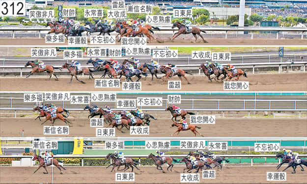 「不忘初心」出閘僅屬一般。 「樂多福」與「漸信名駒」於起步時互相碰撞。「雷超」於躍出時在「幸運骰」與「笑傲非凡」之間受擠迫,「幸運骰」出閘笨拙,而「笑傲非凡」則向外斜跑。「日東昇」出閘笨拙,於起步時急促向外斜跑,導致「心思熟慮」在「戥您開心」內側受擠迫時須勒避。「戥您開心」其後不久被「日東昇」碰撞,當時儘管騎師已努力阻止,但「日東昇」仍持續向外斜跑。其後,自外檔出閘的「心思熟慮」在馬群之後切入。「日東昇」其後受催策,但未能加速,跑過千一米處時在馬群之後切入以取得遮擋。「戥您開心」自大外檔出閘後於早段收慢,切入以取得遮擋。過了七百米處後轉彎時,「雷超」在「漸信名駒」與「幸運骰」之間緊迫競跑,「幸運骰」沿途在沒有遮擋下走外疊。「樂多福」沿途亦在沒有遮擋下走外疊。進入直路後不久,「心思熟慮」在推進至「永常喜」與「財帥」之間的窄位時緊迫競跑,當時「財帥」正在墮退。在此宗事件中,「財帥」被「心思熟慮」挨擦後失去平衡。跑過二百米處時,「大收成」一度在「日東昇」的後蹄內側處於窘境,當時「日東昇」向內斜跑。獸醫於賽後立即檢查「財帥」,並無發現任何明顯異常之處。「樂多福」、「漸信名駒」及「日東昇」均須抽取樣本檢驗。