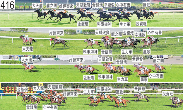 「幸運骰」於開閘時碰撞閘門內側,因而出閘緩慢。「投資旺」出閘笨拙。「贏歌」及「心中有善」自外檔出閘後均於早段在馬群之後切入。何澤堯(「金錢炮」)承認一項不小心策騎〔賽事規例第100(1)條〕,事緣在接近千五米處時,他容許坐騎在尚未帶離「投資旺」時向內移入,導致該駒不必要地受擠迫、須勒避及失去應有的跑線。小組判罰何澤堯由三月六日星期三開始停賽,直至三月十一日星期一才可再次出賽(兩個香港賽馬日)。此外,何澤堯被罰款五萬五千元。於首次跑過終點後被「大天龍」過頭後,「好運齊來」開始十分難以穩定走勢,在「大天龍」之後處於窘境之際不斷昂首。其後於跑過千三米處時,持續十分難以穩定走勢的「好運齊來」試圖自「大天龍」之後向外移出,因而碰撞「龍之團」。持續搶口的「好運齊來」與「龍之團」其後在一段途程上十分緊迫地競跑。「好運齊來」持續搶口直至過了八百米處,此時該駒移至「龍之團」外側,並獲許推進。跑過千二米處時,「生力軍」十分難以穩定走勢,在勒避「金錢炮」的後蹄之際數度昂首。跟隨其後的「投資旺」因而受妨礙。「生力軍」持續十分難以穩定走勢,過了千一米處後向外斜跑避開「金錢炮」的後蹄,其後於跑過九百米處時向外斜跑避開「料事如神」的後蹄。「生力軍」因而在沒有遮擋下走外疊直至接近七百米處,此時該駒能夠向內移回至「料事如神」之後。接近一千零五十米處時,「心中有善」在「幸運骰」之後處於窘境。「金錢炮」於過了一千米處後在一段途程上難以穩定走勢,接近八百五十米處時在「金飯碗」之後處於窘境之際昂首。「心中有善」於轉直路彎時在「幸運骰」之後處於窘境,在直路早段向外移出數疊以望空。跑過五十米處時,「好運齊來」向外移出避開「大天龍」的後蹄。「龍之團」包尾大敗而回,小組認為該駒的表現難以接受。「龍之團」必須試閘及格,並且通過獸醫檢驗後,才可再次出賽。獸醫於賽後立即檢查「生力軍」,內窺鏡檢查顯示該駒的氣管內有很多血。「生力軍」必須通過獸醫檢驗後,才可再次出賽。獸醫於賽後立即檢查「贏歌」,發現該駒流鼻血。獸醫於賽後立即檢查「料事如神」,並無發現任何明顯異常之處,但由於該駒煩躁不安,因而未能替牠進行內窺鏡檢查。獸醫於賽後報告,「金錢炮」左前足蹄冠有一處輕微割傷。「金飯碗」及「金錢炮」均須抽取樣本檢驗。