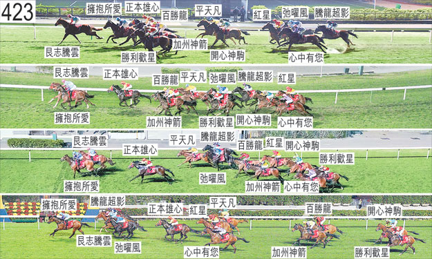 | 「弛曜風」出閘緩慢。「正本雄心」就在開閘前煩躁不安,其後出閘僅屬普通,向外斜跑,並碰撞「紅星」的後軀,「紅星」因而失去平衡。「紅星」其後向內斜跑,導致「正本雄心」在其內側緊迫競跑。「加州神箭」於躍出時在出閘笨拙的「平天凡」與「心中有您」之間受擠迫,當時「心中有您」急促向內斜跑,「加州神箭」因而與「平天凡」互相大力觸碰,「平天凡」的騎師蔡明紹因而嚴重失去平衡,並在一段短途程上右腳脫出腳踏。「騰龍超影」自外檔出閘後於早段在馬群之後切入。接近一千米處轉彎時,「平天凡」一度在「紅星」內側的窄位競跑,當時「紅星」將頭轉側及內閃。過了一千米處後轉彎時,「加州神箭」及「勝利歡星」均在沒有遮擋下走外疊,因而均於過了八百米處後受催策以佔取較前位置。「加州神箭」沿途持續在沒有遮擋下走外疊。「心中有您」於轉直路彎時走勢笨拙。獸醫於賽後立即檢查「加州神箭」及「開心神駒」,並無發現任何明顯異常之處。「擁抱所愛」及「艮志騰雲」均須抽取樣本檢驗。