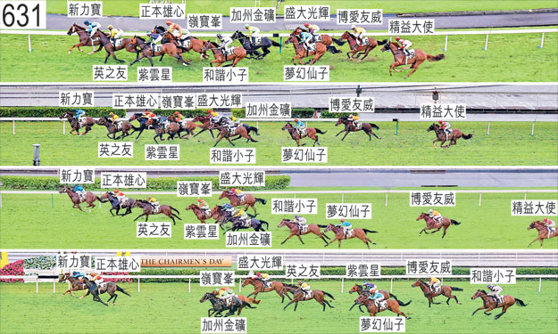 「和諧小子」出閘僅屬一般,儘管於早段受催策,但加速需時。「加州金礦」於躍出時在「盛大光輝」與「精益大使」之間受擠迫,當時「盛大光輝」稍微向外斜跑,而「精益大使」則向內斜跑。在此宗事件中,「盛大光輝」在被「加州金礦」碰撞後軀時失去平衡。「博愛友威」於起步時向內斜跑,碰撞「嶺寶峯」。趨近九百米處時,「博愛友威」將頭轉側及內閃避開「夢幻仙子」。跑過九百米處時,「博愛友威」在「夢幻仙子」與「加州金礦」(何澤堯)之間受擠迫之際大力勒避,當時「加州金礦」稍微向外斜跑避開「正本雄心」的後蹄,繼而將頭轉側及進一步向外斜跑。跟隨「博愛友威」的「精益大使」因而勒避該駒的後蹄。小組譴責何澤堯,並告誡他,儘管此宗事件涉及多項因素,但無論如何,他須確保已充分帶離其他馬匹後才可轉換跑線。跑過八百五十米處時,「夢幻仙子」靠近「和諧小子」的後蹄處於窘境。二百五十米處,「夢幻仙子」向外移出避開「和諧小子」的後蹄,當時「和諧小子」向外斜跑避開「加州金礦」。「紫雲星」沿途在外疊競跑,沒有遮擋。賽後,「精益大使」據報流鼻血。由於這是「精益大使」第三次被發現在競賽期間流鼻血,該駒將被強制退役。獸醫於賽後立即檢查「夢幻仙子」,發現該駒患有「喘鳴症」,而該駒過往亦有此毛病報告。「新力寶」及「正本雄心」均須抽取樣本檢驗。