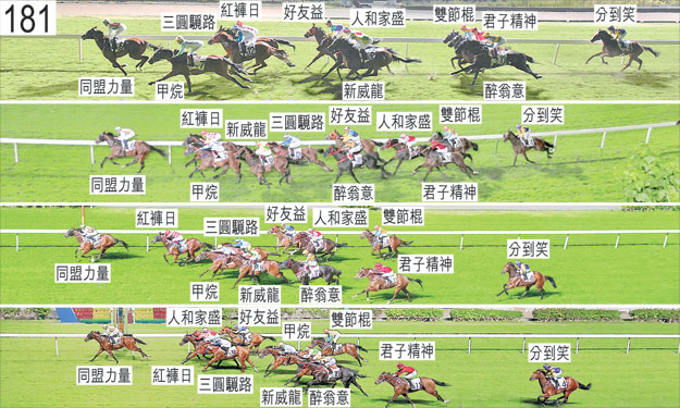 「新威龍」出閘笨拙,向內斜跑,並碰撞出閘笨拙的「甲烷」,「甲烷」因而失去平衡。「雙節棍」出閘僅屬一般。起步後不久,「分到笑」收慢以取得遮擋。起步後跑了一段短途程後,「醉翁意」向內斜跑,碰撞「同盟力量」。「勁得手」於早段在馬群之後切入以取得遮擋。「甲烷」於早段走外疊,過了一千米處後在沒有遮擋下走外疊。其後,「甲烷」於跑過九百米處時獲許上前,跑過七百米處時向內移入至領放馬外側,而「新威龍」於此階段在沒有遮擋下走外疊。趨近首個彎位時,「分到笑」將頭轉側,向內斜跑避開「君子精神」(梁家俊),並碰撞「雙節棍」。「分到笑」其後開始十分難以穩定走勢,急促向外斜跑避開「君子精神」的後蹄,當時「君子精神」將頭轉側並內閃橫越「人和家盛」的後蹄。這導致居於「分到笑」內側的「雙節棍」受妨礙,而「醉翁意」則在「分到笑」急促向外斜跑橫越「君子精神」的後蹄之際向外移出。其後,「分到笑」持續搶口。小組告誡梁家俊,雖然此宗事件主要由「分到笑」及「君子精神」兩駒的走勢造成,但無論如何,他必須確保作出最大努力阻止坐騎斜跑。趨近八百米處時,「好友益」在「紅褲日」之後處於窘境。過了八百米處後,「人和家盛」開始搶口,並靠近「三圓䮭路」的後蹄處於窘境至跑過六百米處。接近四百五十米處時,「好友益」一度在「三圓䮭路」的內側緊迫競跑,當時「三圓䮭路」將頭轉側,內閃避開「新威龍」。直路早段,「分到笑」內閃,不願移至馬群外側。小組提醒李寶利(「雙節棍」),在適當的情況容許下,他有責任至少手足並用力策坐騎至終點。獸醫於賽後立即檢查「勁得手」,發現該駒患有「喘鳴症」,而該駒過往亦有此毛病報告。獸醫於賽後立即檢查「醉翁意」,並無發現任何明顯異常之處,但由於該駒煩躁不安,因而未能替牠進行內窺鏡檢查。獸醫於賽後立即檢查「君子精神」,並無發現任何明顯異常之處。「同盟力量」及「紅褲日」均須抽取樣本檢驗。