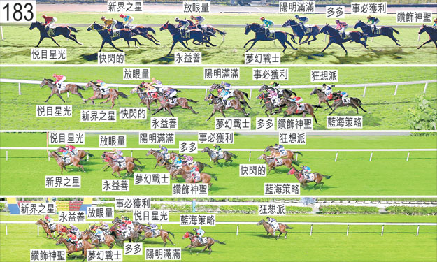 「陽明滿滿」出閘僅屬一般。「鑽飾神聖」出閘笨拙,向內斜跑,碰撞「事必獲利」的後軀。其後,自外檔出閘的「事必獲利」及「鑽飾神聖」均收慢以取得遮擋。同樣自外檔出閘的「藍海策略」及「狂想派」均在馬群之後切入以取得遮擋。過了千三米處後,「新界之星」被「悅目星光」超越,繼而搶口,並在該駒之後處於窘境。趨近千二米處時,「多多」一度在「夢幻戰士」的後蹄外側處於窘境,當時「夢幻戰士」移離內欄。進入直路時,「事必獲利」向內移入避開「快閃的」,當時「快閃的」急促墮退。跑過五十米處時,「陽明滿滿」在「悅目星光」的後蹄外側處於窘境。小組提醒潘明輝(「藍海策略」),在適當的情況容許下,他有責任至少手足並用力策坐騎至終點。被查詢時,蘇兆輝表示,他獲解釋,「夢幻戰士」上仗在陣上過於搶口後轉弱。他說,他因而獲指示確保「夢幻戰士」在是晚賽事中放鬆來跑,且覺得「悅目星光」應會領放,讓「夢幻戰士」有機會可佔取該駒之後有遮擋的位置。他說,坐騎出閘令人滿意,但前速不及預期般快。他說,鑒於他獲告知坐騎上仗跑來過於搶口,他不願催策坐騎,坐騎因而居於較賽前部署稍後的位置競跑。賽後,潘頓未能就「悅目星光」令人失望的表現提供任何解釋。他說,坐騎走勢令人滿意,但於直路早段未能如他預期般加速,末段墮退,走勢令人失望。獸醫於賽後立即檢查「悅目星光」,並無發現任何明顯異常之處。被查詢有關「快閃的」令人失望的表現時,希威森表示,他須於早段耗用坐騎和上仗相若的力氣以佔取前列位置。他說,過了千三米處後,他將坐騎移至領放馬外側競跑,坐騎其後能放鬆來跑,走勢暢順直至過了五百米處後須受催策。他說,他對坐騎於轉直路彎時迅速墮退及於直路早段已顯著轉弱有疑慮。他續說,他於直路早段催策坐騎,但坐騎持續墮退,由於他認為坐騎的身體可能出現問題,因此於最後二百米收慢坐騎。獸醫於賽後立即檢查「快閃的」,內窺鏡檢查顯示該駒的氣管內有很多痰。「快閃的」必須通過獸醫檢驗後,才可再次出賽。「悅目星光」、「新界之星」及「鑽飾神聖」均須抽取樣本檢驗。