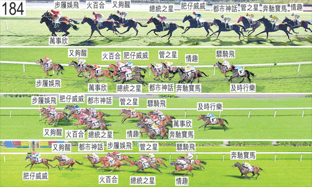 「管之星」出閘緩慢。「奔馳寶馬」出閘笨拙,因而失地。「情趣」於起步時向內斜跑,碰撞「及時行樂」。其後,「情趣」及「及時行樂」均收慢以取得遮擋。 「驃騎飛」自大外檔出閘後於早段在馬群之後切入以取得遮擋。搶口的「萬事欣」於過了一千米處後轉彎時走勢笨拙及向外斜跑。「萬事欣」於過了九百米處後向內移回至領放馬外側時,「火百合」一度靠近該駒的後蹄處於窘境。跑過五百米處時,「管之星」與「都市神話」互相碰撞。跑過一百米處時,「都市神話」在「步履娛飛」外側緊迫競跑,當時「步履娛飛」向外斜跑。被查詢有關「及時行樂」的表現時,李寶利表示,他於早段將坐騎在馬群之後切入,坐騎走勢暢順,直至過了八百米處後隨即須受催策。他說,他須大力催策「及時行樂」以嘗試保持在「奔馳寶馬」之後的位置,但坐騎對其催策毫無反應,在轉直路彎時未能上前,在直路上顯著墮退,表現令人十分失望。獸醫於賽後立即檢查「及時行樂」,並無發現任何明顯異常之處。「及時行樂」上仗跑獲亞軍,今仗卻在馬群後列過終點,小組認為該駒的表現難以接受。「及時行樂」必須試閘及格,並且通過獸醫檢驗後,才可再次出賽。獸醫於賽後立即檢查「萬事欣」,並無發現任何明顯異常之處。「步履娛飛」、「肥仔威威」及「又夠醒」均須抽取樣本檢驗。